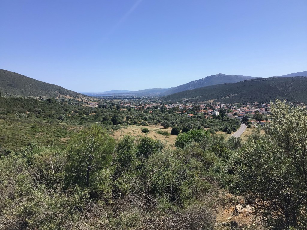 Et, effectivement, ça grimpe pendant une quinzaine de bornes sur la route A132 avec 500 de D+. Je traverse les villages de Ano Souli, Grammatiko (cela ne s’invente pas) et j’arrive à Varnavas. La vue sur les collines environnantes et la mer au loin est magnifique. Et je ne vous parle pas des villas construites sur les hauteurs à l’entrée du village.