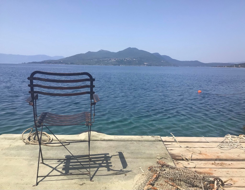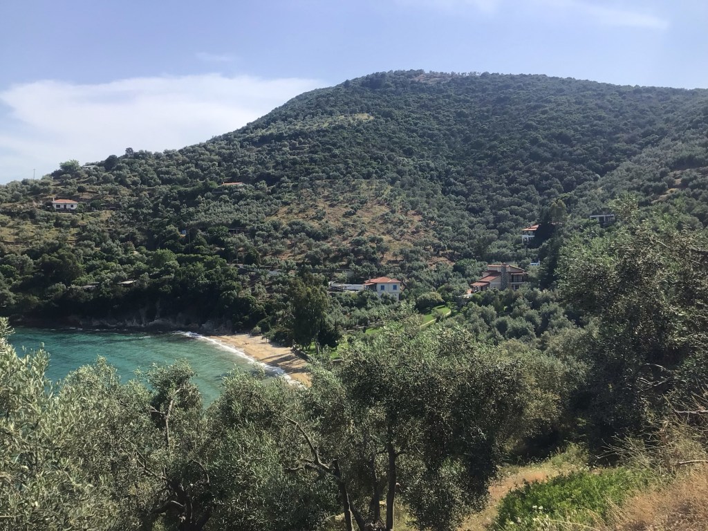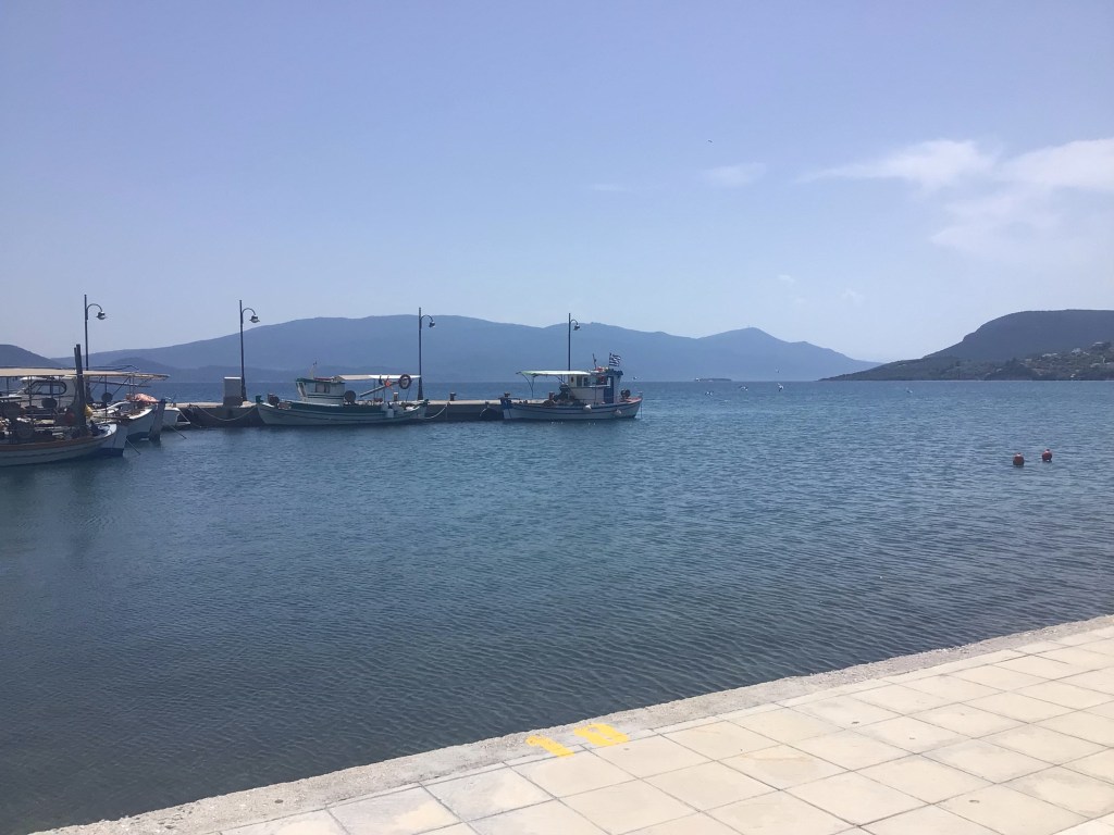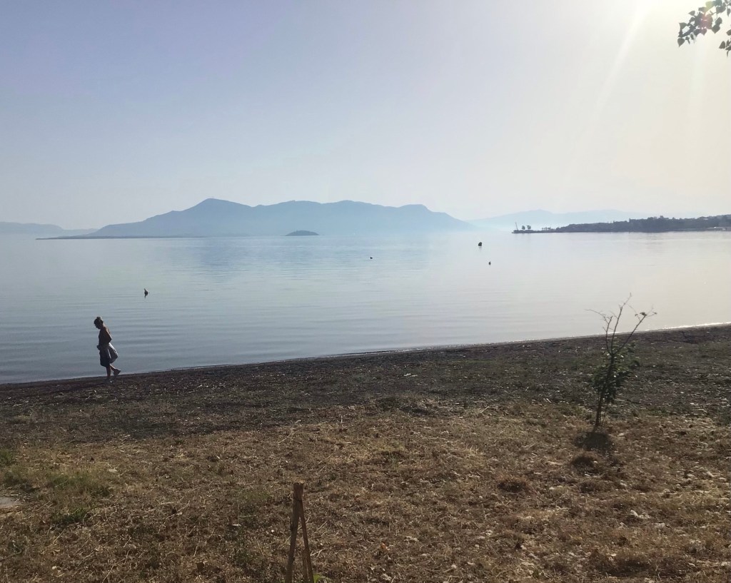 Je roule pendant un certain temps à travers le triptyque du coin : oliviers, amandiers et vignes. Je traverse quelques villages campagnards. Heureusement que j’ai pu dépanner mon iPhone et le recharger, sinon j’aurais été mal avec toutes ces petites routes qui s’entrecroisent à travers cette campagne. Je rejoins la mer dans la charmant station balnéaire de Kamena Vourla. La plage est déserte à part cette marcheuse solitaire. Au loin dans la brume matinale, l’île de Chalcis que je vais rejoindre.
