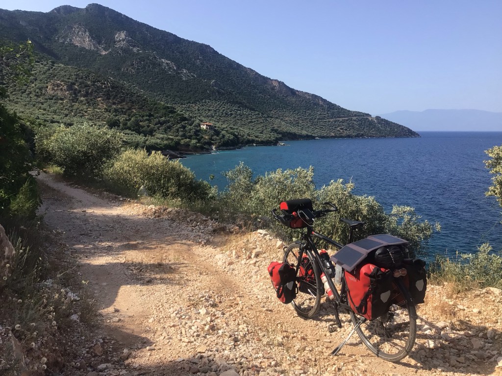 Une fois à Edipsos, je remonte sur mon destrier pour effectuer une dizaine de kilomètres afin de rejoindre le petit port de Agiokambos. Avant cela, j’immortalise la pointe à l’extrême nord de cette immense île tout en longueur de Chalcis. J’ai juste une petite grimpette que j’effectue en danseuse sur la plaque du milieu. De la rigolade par rapport à mes nombreuses ascensions des jours précédents.