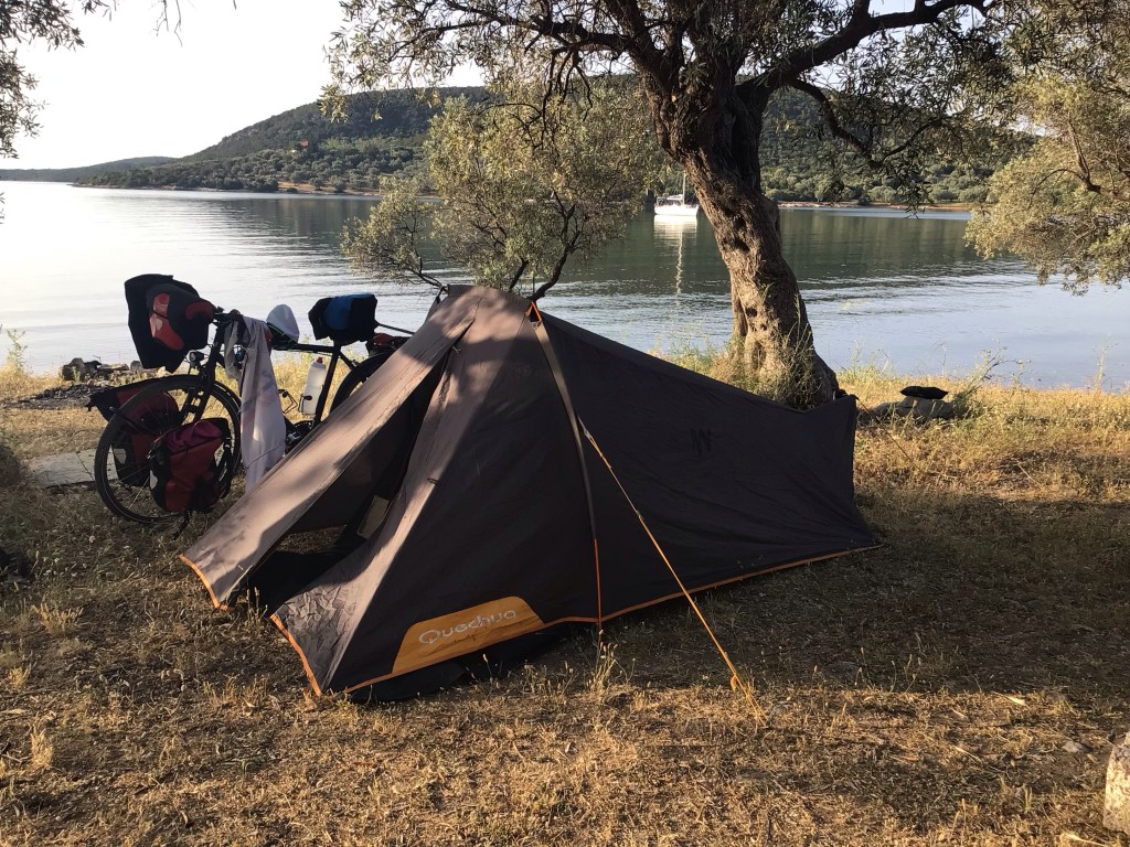 Je vadrouille ainsi pendant un certain temps pour ne pas dire un temps certain avant d’arriver enfin dans la superbe baie de Nies où le revêtement devient bitumé. Quelques personnes connaissent apparemment la promenade des anglais. Même un voilier y mouille. Vu l’heure avancée, je me pose et me mouille aussi (nouvelle baignade dans une eau à +25°C) avant de monter mon campement pour la nuit à l’ombre de deux oliviers.
