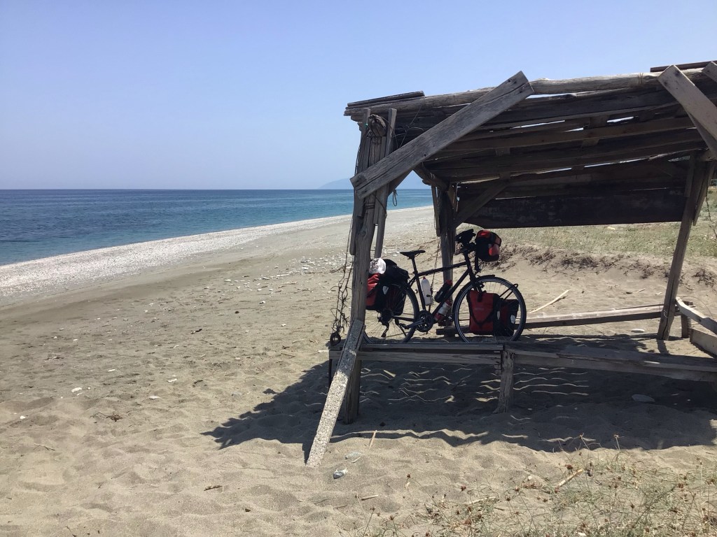 Après avoir passé Agia, il me reste une belle montée avant de redescendre enfin sur la mer. J’arrive à Agioskampos juste à l’heure de déjeuner. Je m’arrête dans une boulangerie pour me constituer mon pique-nique. Puis je file le long de cette immense plage de sable gris et de galets avant de trouver une cabane brinquebalante où m’abriter du soleil qui plombe sacrément.