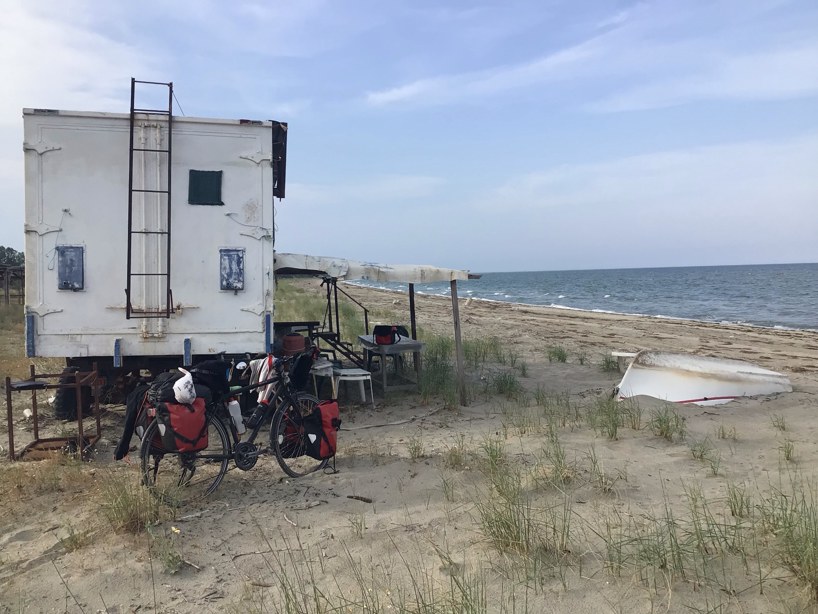 Je pique-nique, sieste et me baigne seul sur cette immense plage. Le sable est brûlant. L’eau est tiède. Le bonheur est dans le voyage. Je reprends ma route, parfois éboulée, le long de cette plage où il n’y a vraiment pas grand monde. Pourtant, la saison se prépare dans les quelques petites stations balnéaires. Après Vélika, cela se complique.