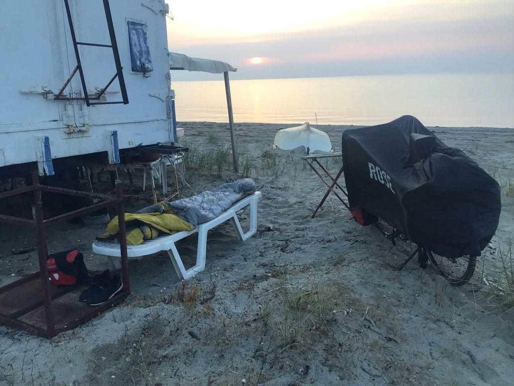Réveillé en même temps que l’astre solaire, je m’extirpe de ma chaise longue pour une nouvelle journée de vadrouille en toute liberté. Je range duvet et matelas gonflable (qui doit être légèrement percé), déjeune attablé, plie mes affaires et reprends ma route vers le nord. La soirée a été gâchée par une attaque en règle de moustiques. J’ai dû vite fait me planquer dans mon duvet et attendre que le soleil se couche et que le vent revienne avant de pouvoir bouquiner en paix.
