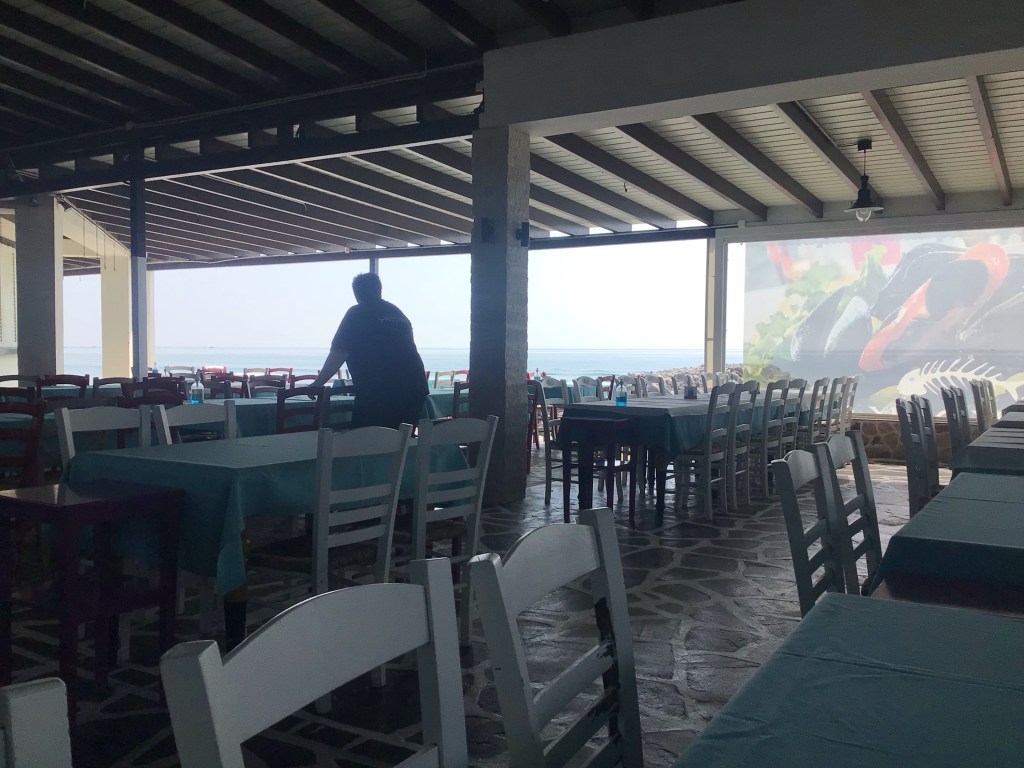 En milieu de matinée, je m’arrête dans un bar-restau en bord de mer dont le nom est psarokokkalo. J’adore. Je suis seul sur cette grande terrasse qui donne sur la mer. La patronne, une femme assez corpulente, austère au premier abord mais finalement très sympathique m’enseigne quelques expressions grecques pour ma commande matinale. Ensuite, elle prépare sa salle et attend la clientèle pour le service du midi. De mon côté, je n’attends plus personne et reprends donc la route.