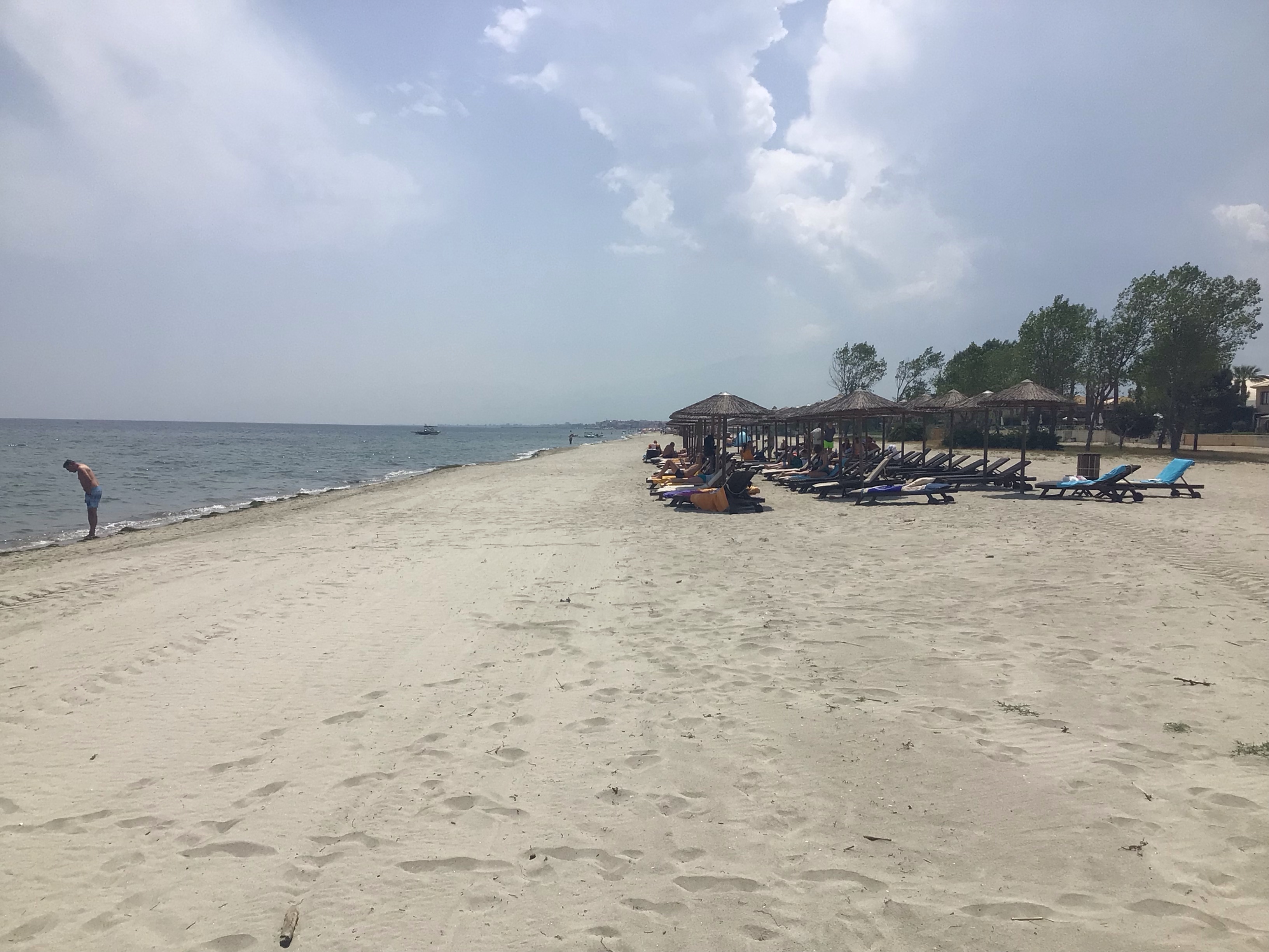 Arrivé à Leptokarya, je prépare mon pique-nique que je vais manger à l’ombre dans un parc privé. Puis je m’allonge sur mon banc et je sieste. Je m’éloigne au maximum de cette immense plage où les plages privées s’enchaînent les unes après les autres. On se croirait en Italie avec les lidos. Il fait beau et chaud. C’est blindé de monde en ce samedi. J’arrive tout au bout de ces plages privées où la densité se raréfie. Je me pose, me baigne en laissant ce monsieur qui a l’air bien dubitatif. Et oui, l’eau, ça mouille ! Puis je vais me boire un expresso bien serré avant de repartir sous le cagnard.