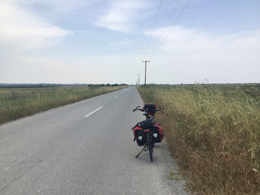 Il y a juste un gros tape-cul pour contourner le Fort Platamonas avec une montée à 15%. Après cela repart sur le calme plat. Le sketch de la matinée est ce car de touriste qui s’est planté dans une méchante rigole après un stop. Je les laisse se démerder. Plutôt que de prendre des petites routes, le chauffeur n’avait qu’à prendre l’autoroute.