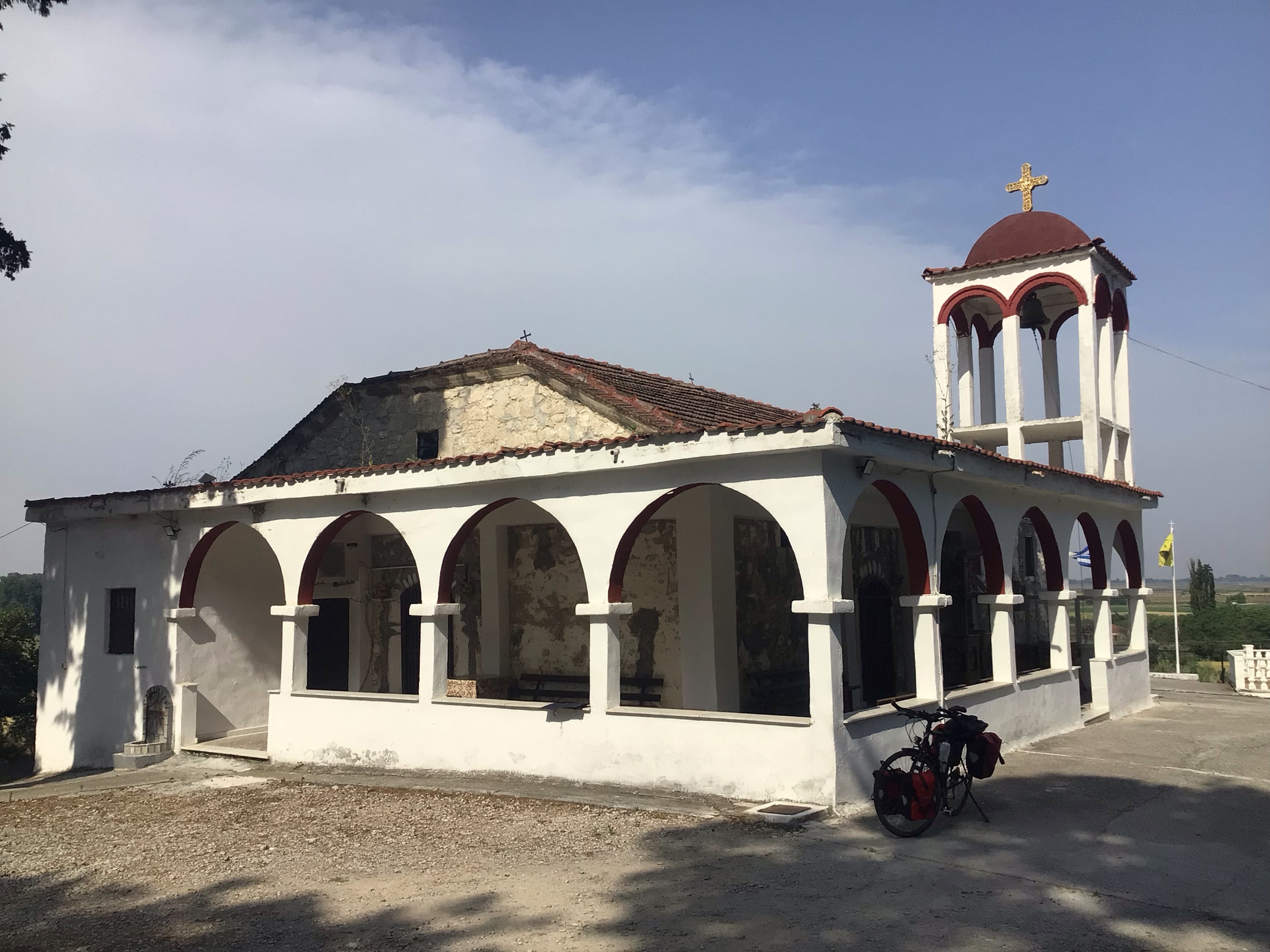 17h approche. Je scrute également mes cartes pour repérer un endroit pour cette nuit. Je repère un cimetière dans le hameau suivant de Megali Gefyra. Je m’y rends. Un chemin en béton très pentu part à gauche de la route et monte au cimetière et … à sa magnifique chapelle. Bingo ! Ce sera à nouveau parfait pour cette nuit.