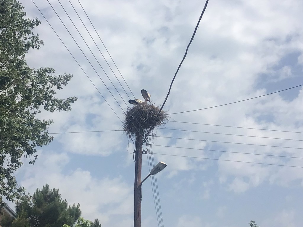 Réveillé aux aurores par le craquettement d’un couple de cigognes perchées dans leur nid en face l’église, je me lève et me prépare. Elles font un boucan d’enfer comme dit Renaud. J’imagine que la mère enguirlande le père pour qu’il s’affole un peu et aille chercher à manger pour leurs deux cigogneaux qui réclament leur pitance.
