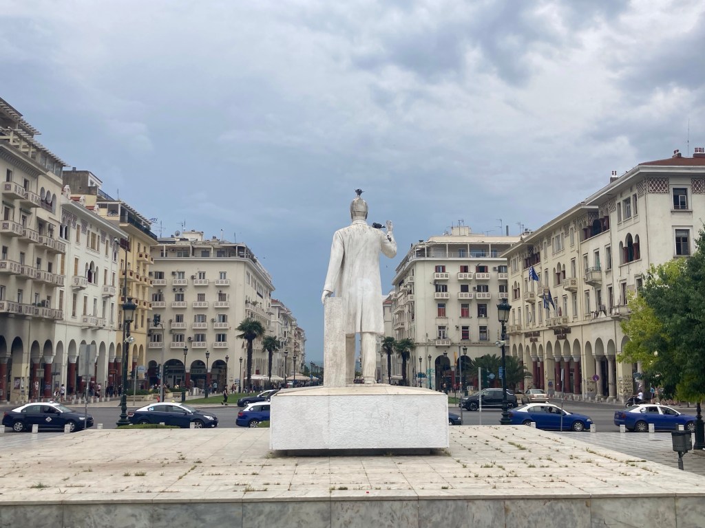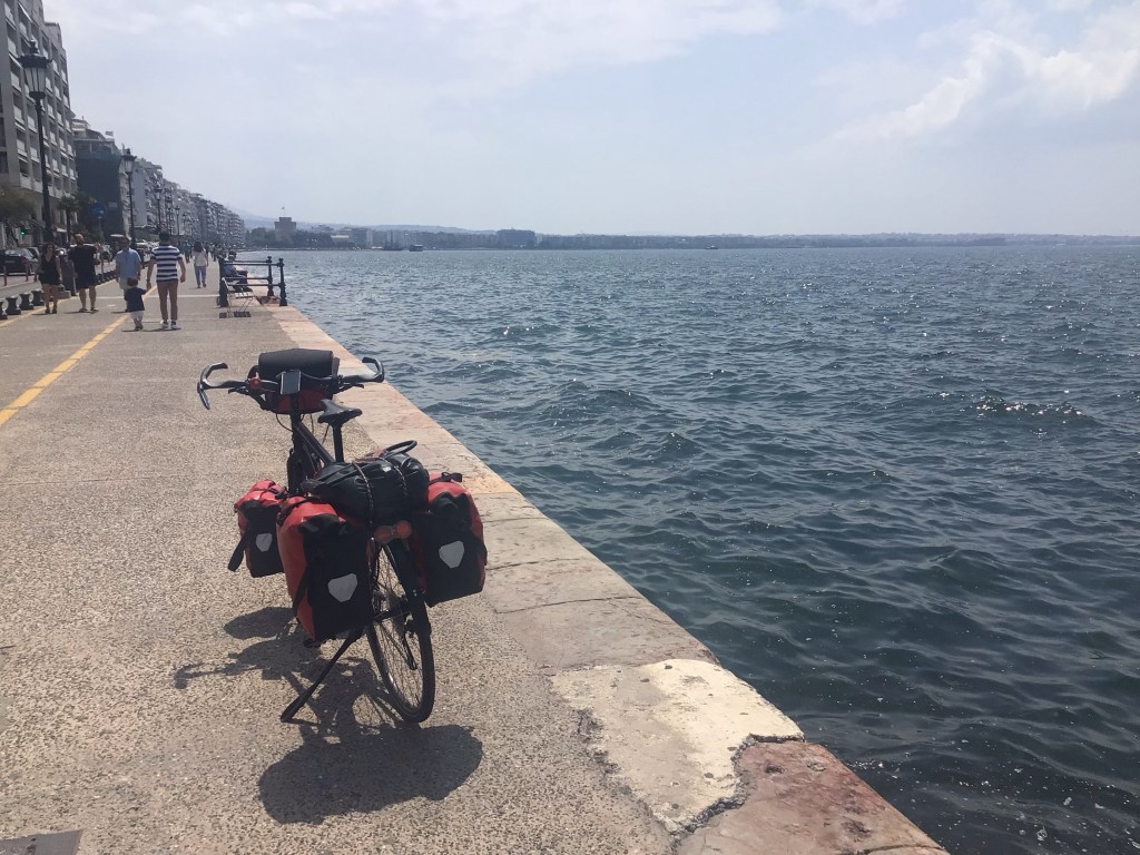 Les premières entreprises apparaissent. La route s’agrandit. La ville approche. J’arrive par la zone industrielle, les raffineries et le port de commerce. Génial ! Heureusement que nous sommes dimanche et que les camions ne circulent pas. Vers 12h30, je finis enfin par parvenir, en empruntant une belle piste cyclable, le long d’une immense promenade en bord de mer. Me voici arrivé dans la seconde ville grecque la plus peuplée avec plus d’un million d’habitants en comptant sa périphérie.