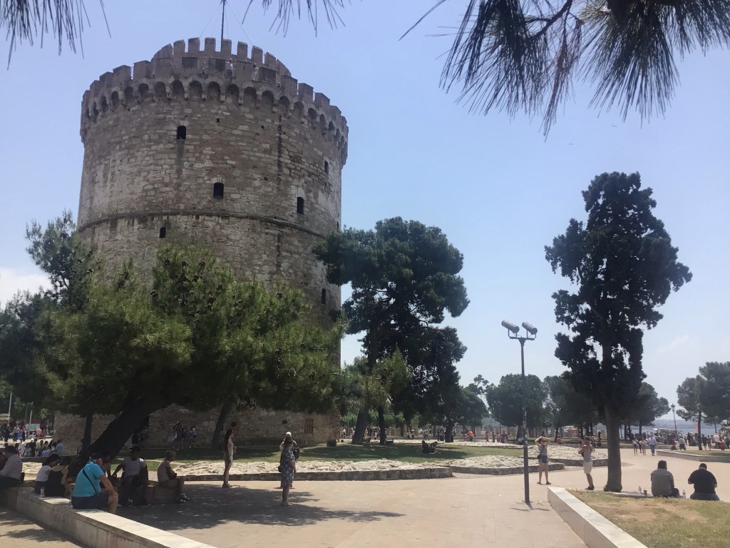 Plutôt que de me poser dans un restaurant que je réserve pour ce soir, je m’achète un gyro pita / bira à 5€ et vais pique-niquer à l’ombre de la Tour Blanche. Beaucoup de blacks essaient de vendre leur camelote à la sauvette. J’ai même la visite d’une petite gamine adorable … qui vient aussi renifler mon sandwich. Désolé ma puce mais j’ai trop les crocs !