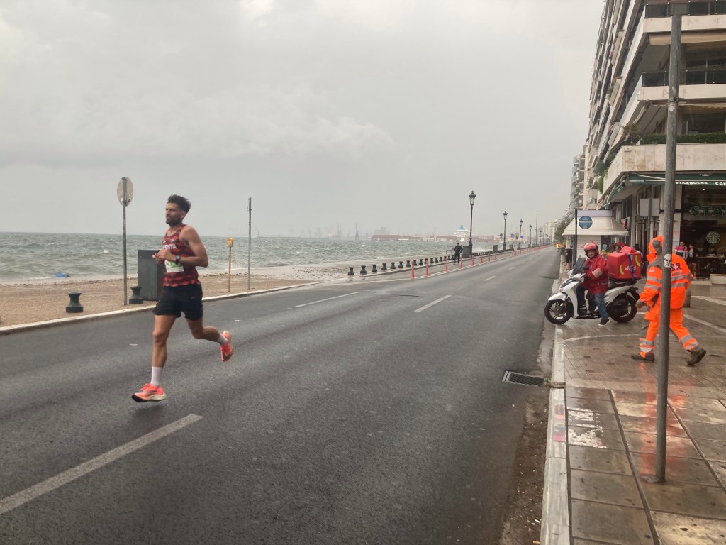 En fin d’après-midi, alors que je rentre à pied en direction de mon MyHome, le ciel s’assombrit méchamment. De plus, une rue se trouve bloquée par de la rubalise et une femme portant gilet jaune. Je me retrouve au milieu d’une course à pied (le 10 kms de Thessalonique qui se court en plein centre ville). J’ai à peine le temps de rejoindre la promenade de ce matin que l’orage éclate alors que les premiers coureurs arrivent au 9é km. C’est le déluge. La température a chuté. La mer est si démontée que des vagues essaient de venir lécher les pieds des coureurs pour les faire finir plus vite.
