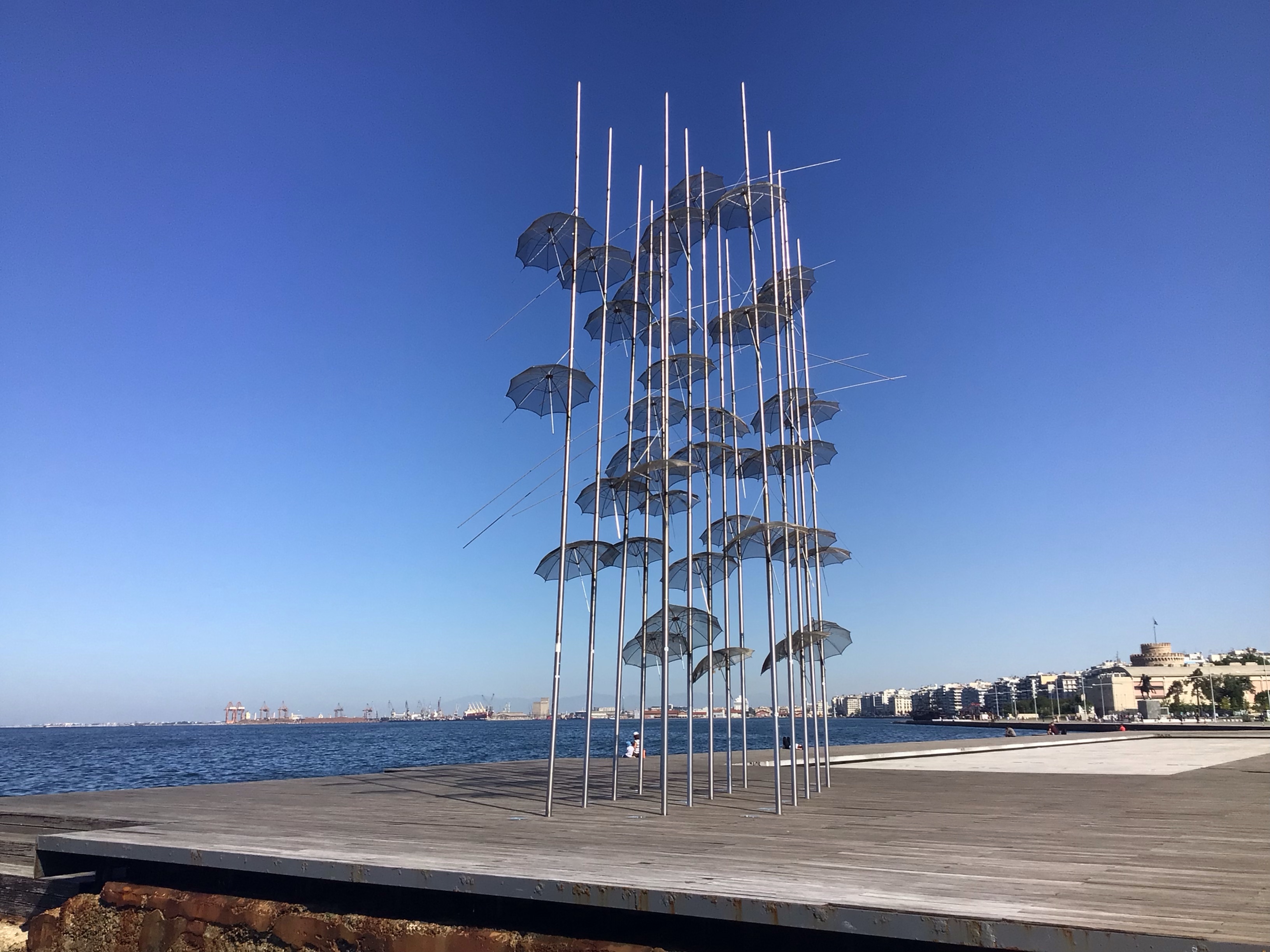Je passe finalement avant lui vu que ma demande est beaucoup moins compliquée. A 9h30, j’ai finalisé les papiers pour la procuration. Je souhaite bonne chance à mon jeune compatriote et reprends ma route. Je pars au sud de Thessaloniki toujours en suivant la côte et en faisant le tour de la péninsule aux trois pattes. Avant cela, j’immortalise la sculpture aux parapluies.
