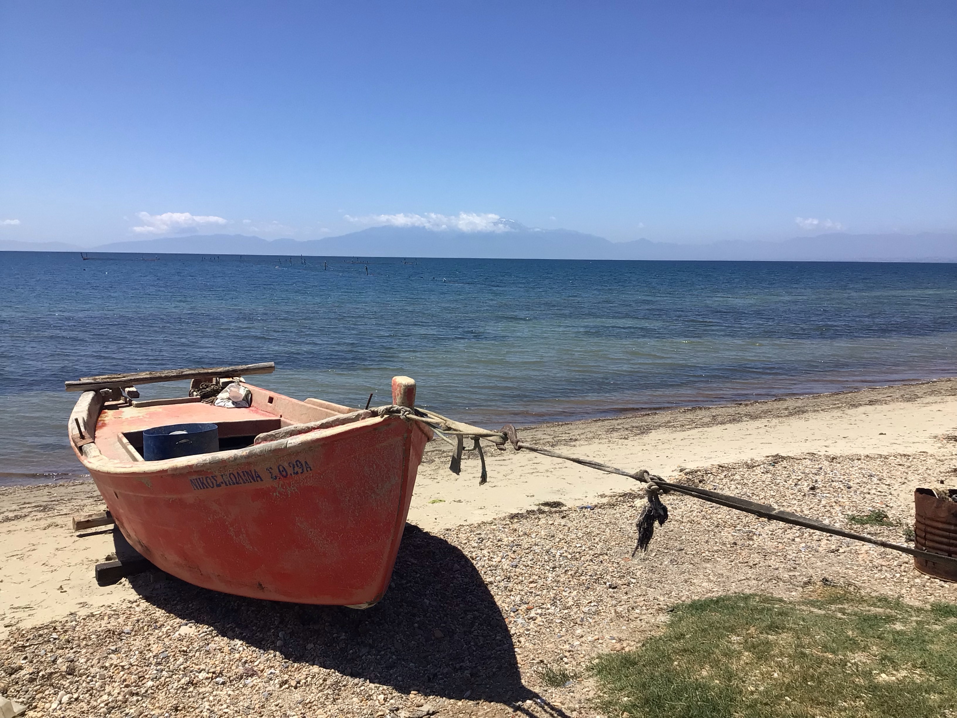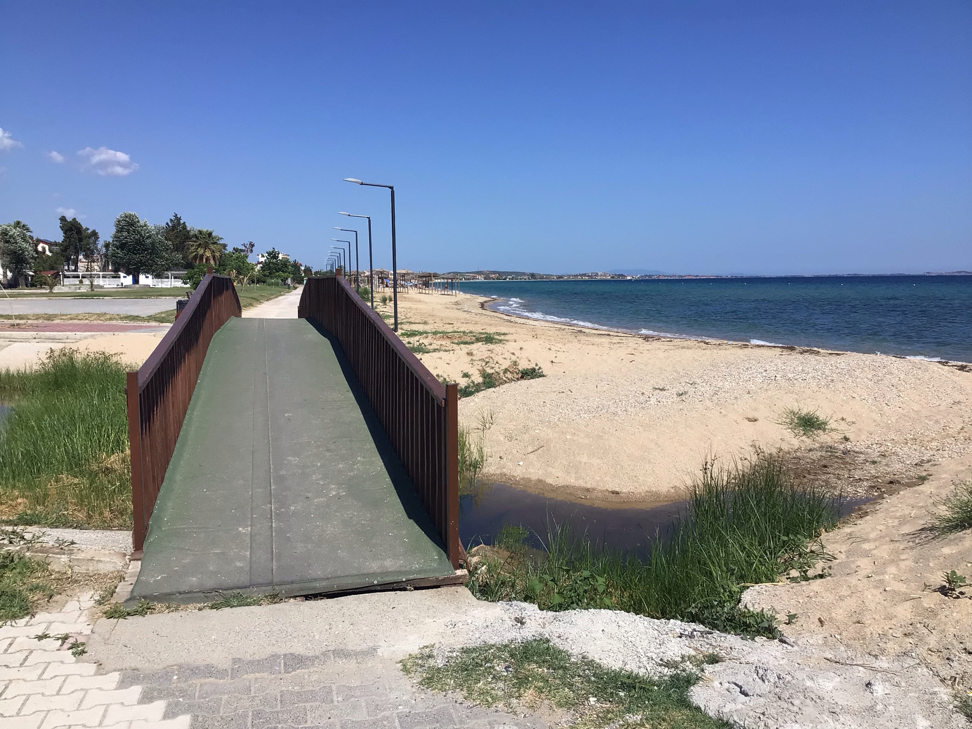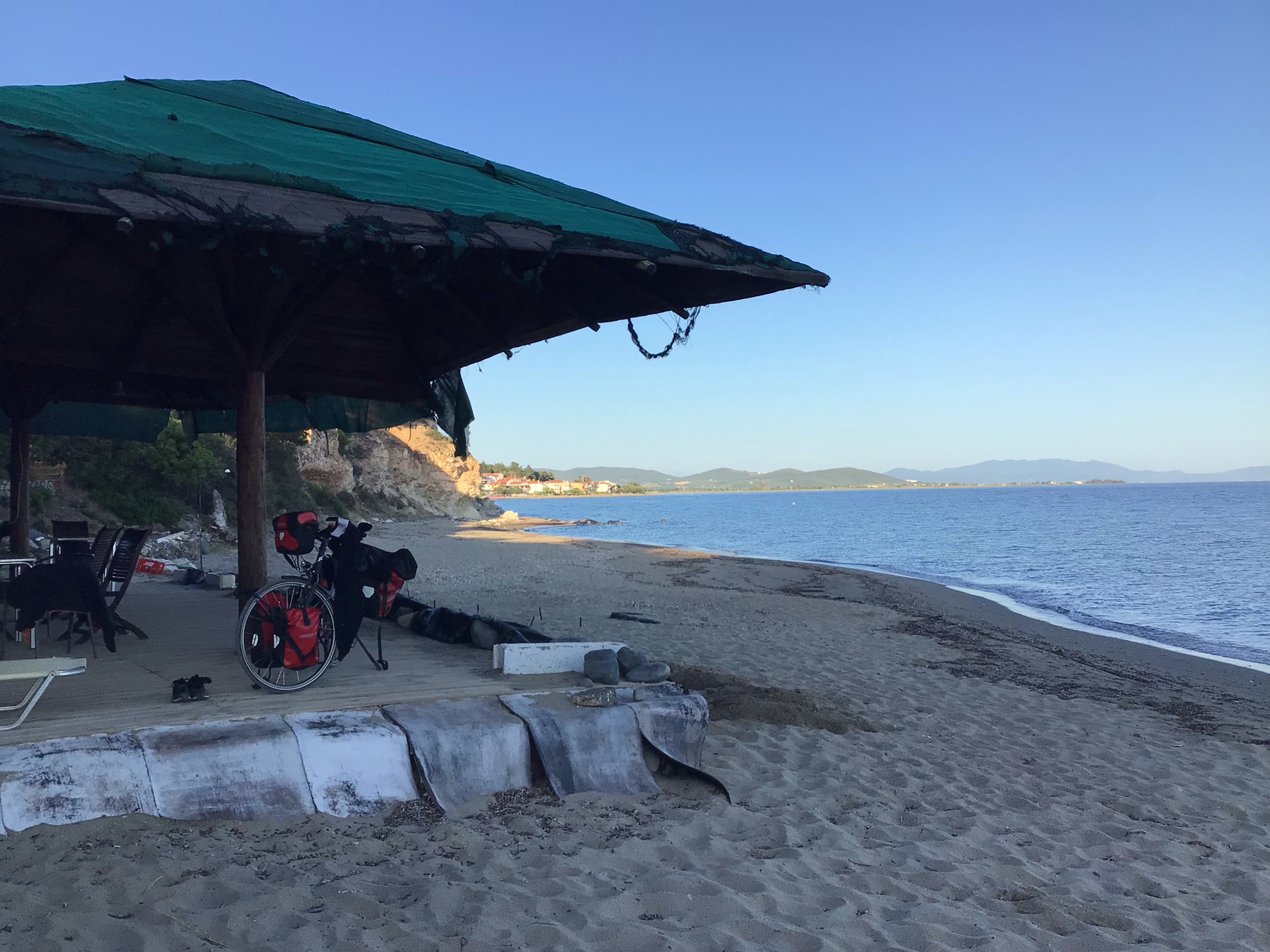 Les grandes stations balnéaires aux belles plages de sable fin s’enchainent sur cette façade ouest jusqu’au Cape Epanomi. Ensuite, au sud, ce sera un peu plus compliqué. Je commence ma descente avec en toile de fond le Mont Olympe et les nuages accrochés à sa cime.