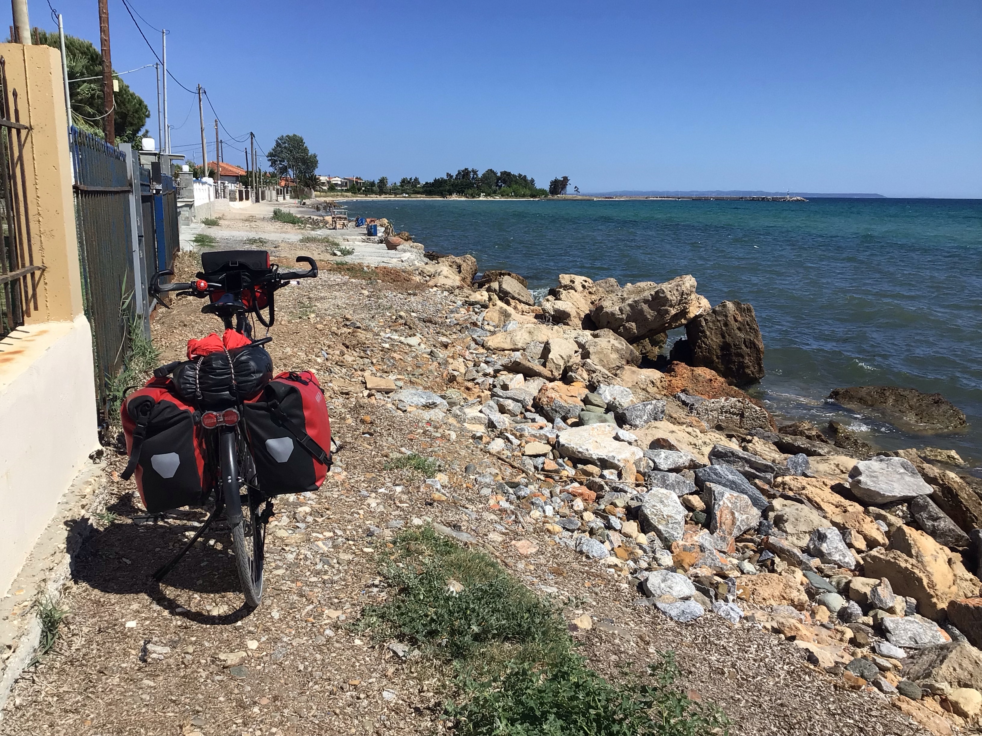 Hier, j’étais arrivé par la zone industrielle. Aujourd’hui, je pars par la zone commerciale et aéroportuaire. C’est tout aussi fun ! En ce lundi matin, je roule le long d’une 2*3 voies pour quitter cette mégalopole. A Agia Triada, première station balnéaire après l’aéroport, je m’arrête boire mon café frappé et contempler l’immense baie de Thessaloniki.