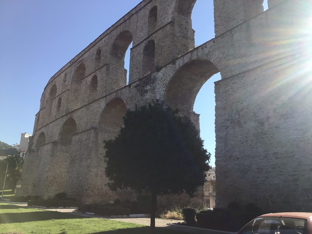 Jusqu’à Kavala, la route est particulièrement chiante et dangereuse. Le vent est de retour plein dans le pif. Ça monte et ça descend d’une baie à l’autre. La circulation est dense en ce jeudi matin sur cette 2*2 voies sans bande d’arrêt d’urgence. J’arrive enfin dans cette grande ville portuaire sans aucun charme. La 2*2 voies traverse la ville de part en part avec, sur la droite, un trottoir et en-dessous la plage et, sur la gauche, des rangées d’immeubles. Bonjour le bruit et la pollution ! Je sors en passant sous l’aquaduc d’origine romaine mais reconstruit par les Bysantins au XVIé siècle.