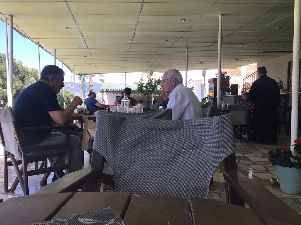 Je dois ensuite contourner l’estuaire de la rivière Mesta dans lequel se trouve l’aéroport de Kavala. C’est la raison pour laquelle je croise aussi énormément de bus. En milieu de matinée, je m’arrête dans le bourg rural de Neos Xerias. Il y a toujours autant de monde en terrasse. Même le pope (à droite de dos) boit son café matinal et fait la tournée des popotes (normal, il fait son boulot de pope !).