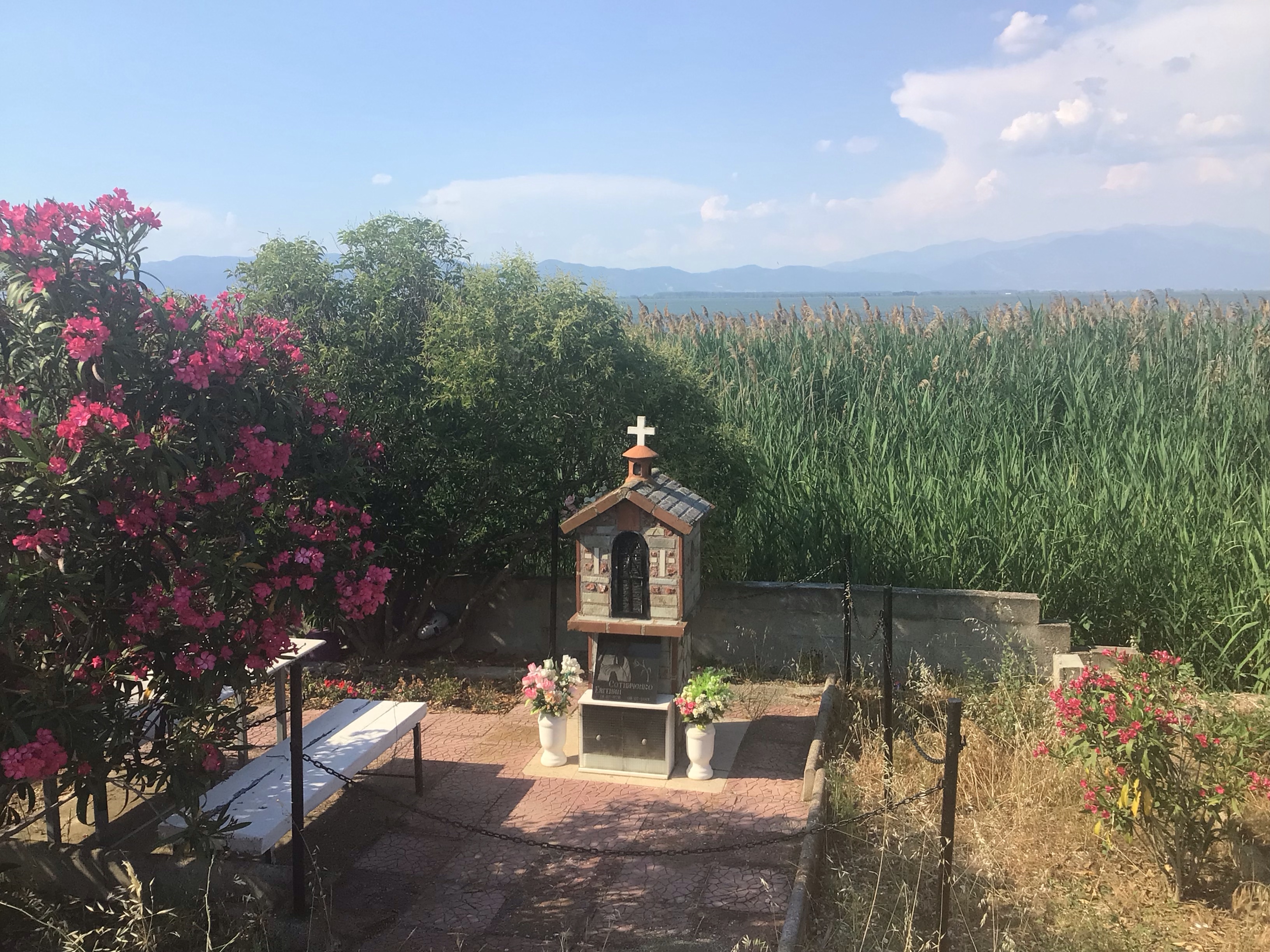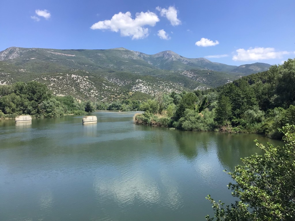 Avant de quitter ce bourg, je vais prendre un café grec au café Anonymous. Le patron, la quarantaine svelte mais au crâne qui se dégarnit, vêtu d’un jean et d’un tee-shirt noir, m’accueille et me demande d’où je viens. Je lui raconte mon périple et où je me rends : Istanbul qu’il traduit par Constantinople au client grec à sa table. Au moment de payer mon café à 1€, je lui tends un bifton de 20€. Il me le rend et insiste pour me remplir toutes mes gourdes d’eau fraîche. Je repars et retrouve la route EO2 pour aller vers Lagos. Je franchis cet isthme avec sur ma gauche l’immense lac Vistonida …
