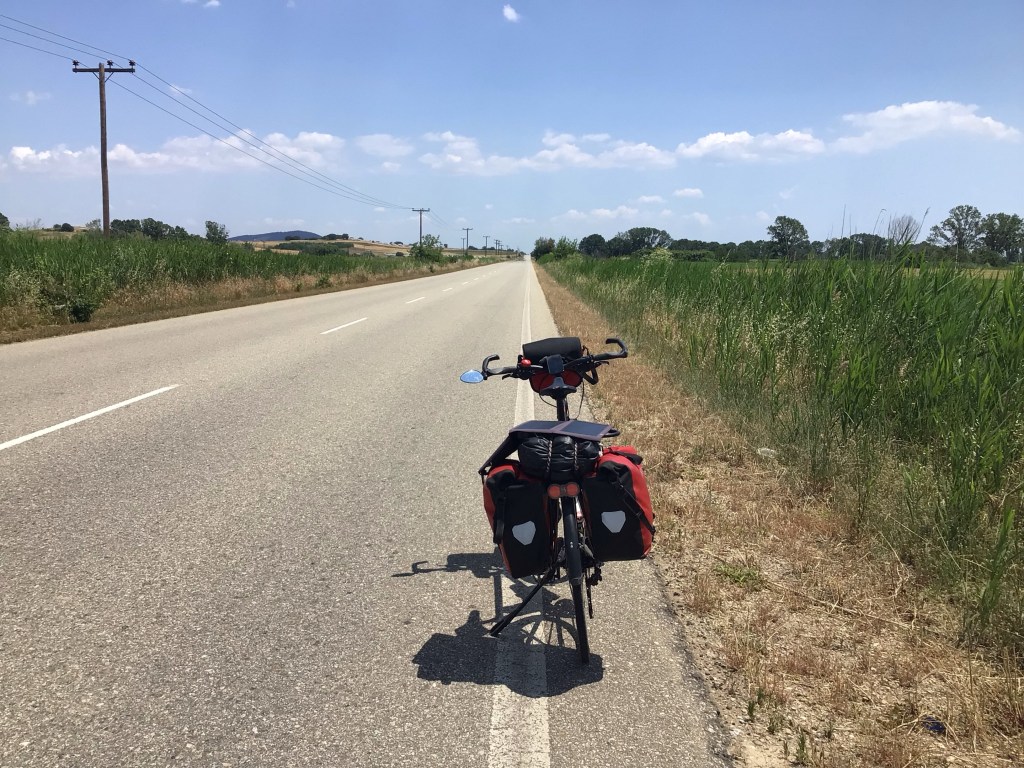 Le vent d’est souffle dans cette plaine immense et pratiquement plate. Pour l’instant, je l’ai sur le côté. Cela ne va pas durer. Je traverse de petites bourgades paysannes. Je m’arrête dans l’une pour acheter une boisson fraîche et des gâteaux. Je repars sous le cagnard. Arrivé à Mikrochori, je tourne à gauche et me prends le vent pleine face. Le « calvaire » commence. Je vais me prendre le vent pendant 26 bornes sur une longue ligne droite bordée par des champs. Bonjour le moral !
