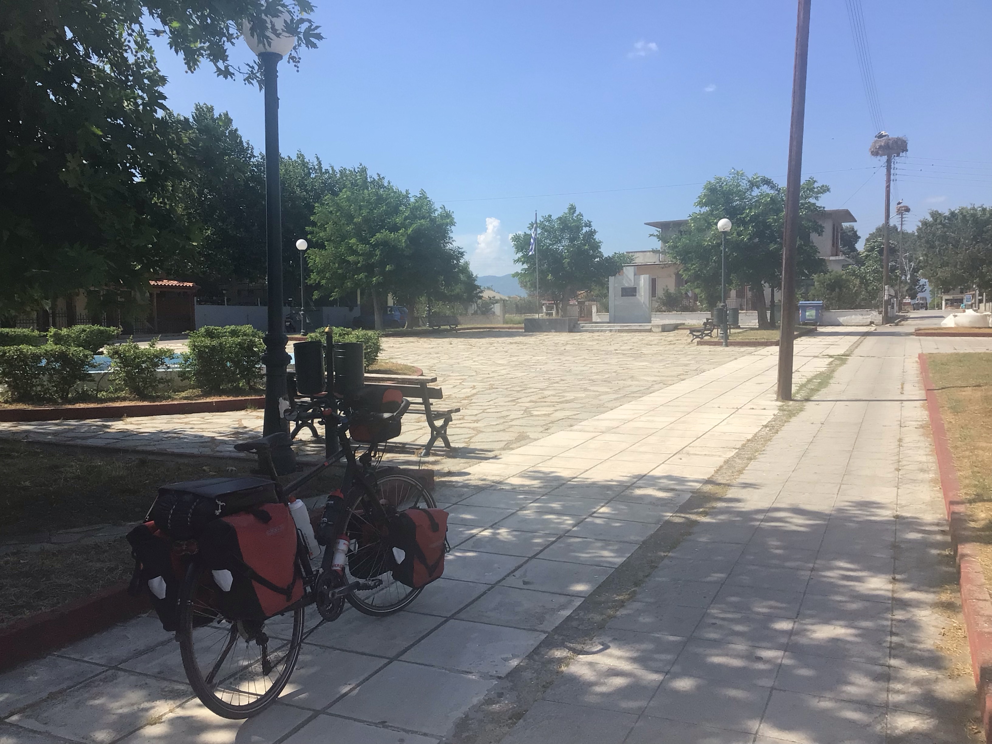 Je me traîne à 14km/h tête dans le guidon. J’ai branché la musique sur Led Zepp’ pour me filer la pêche. Je ne traverse aucun village. Et les rares bourgades ne proposent aucune taverna. Ma flotte est chaude. L’heure avance et moi aussi … mais vraiment péniblement. J’arrive enfin à Nea Kessani, une bourgade un peu plus importante. Je rentre à l’intérieur et trouve une taverna sur la place principale. Cela ne paie pas de mine. Mais j’ai juste faim et soif. Le patron me propose des souvlakis au poulet accompagnés une salade de tomates, concombres, oignons. Et une bonne bière fraîche de la tireuse. Pour 10€, ce sera parfait. Je règle puis vais m’allonger sur un banc à l’ombre en réglant mon horloge sur 16h00. (A gauche au fond : la taverna, à droite en haut : les cigognes, derrière moi : mon banc ombragé).
