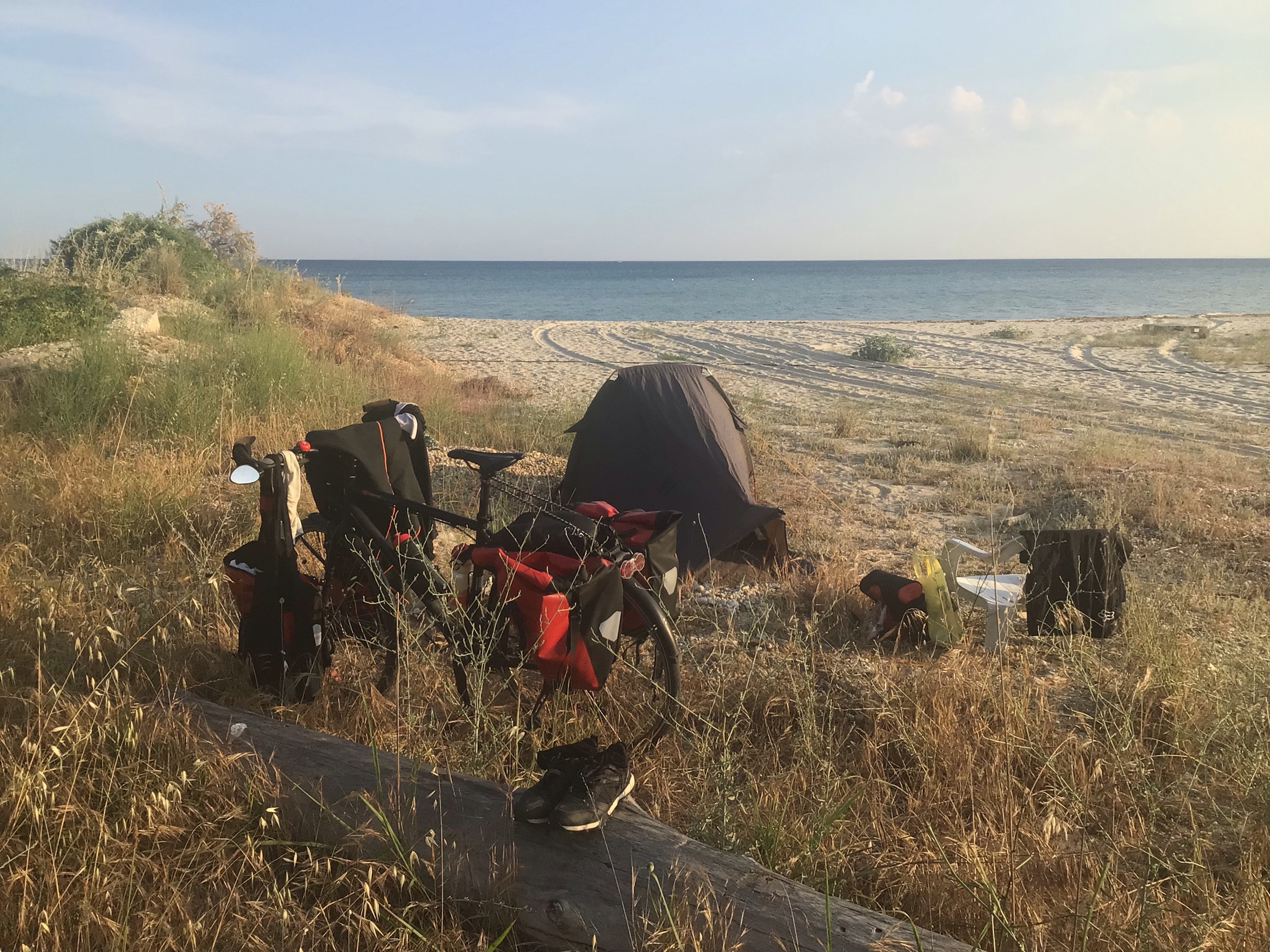 Je passe Lagos au milieu de l’isthme puis prends vers l’ouest, vent dans le dos à +30km/h jusqu’à Fanari. Je m’y arrête faire mes emplettes quotidiennes. Puis retrouve enfin ma mer nourricière, inspiratrice et apaisante. Je longe un chemin menant à un cul-de-sac et à un petit emplacement parfait en bord de plage. Je m’installe, vais me baigner, prends une douche et attaque la soirée. Bonjour la journée !