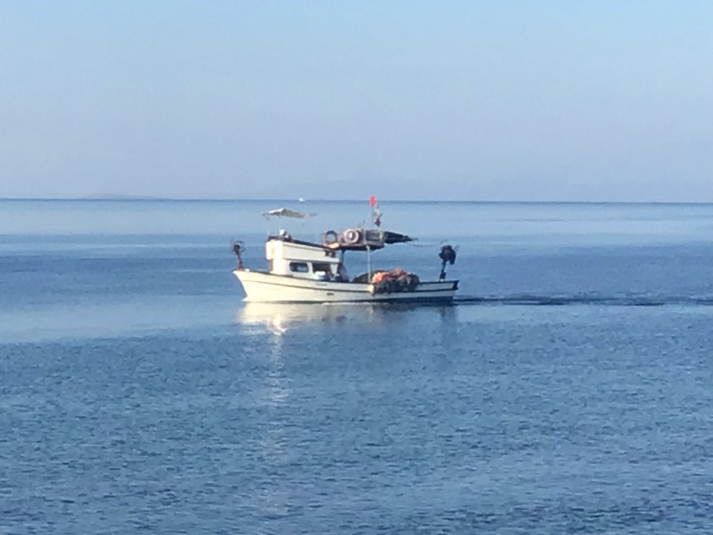 Pour me distraire, un bateau de pêche, où le capitaine est perché en haut, fait des allers-retours le long de la côte. Je profite aussi de la source pour laver mon vélo et mes sacoches à l’éponge. Il est 7h30, je reprends la petite route pour revenir en ville.