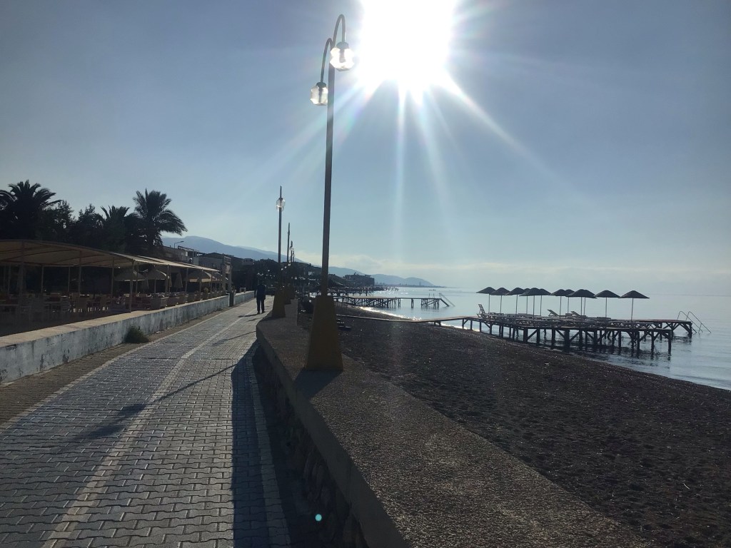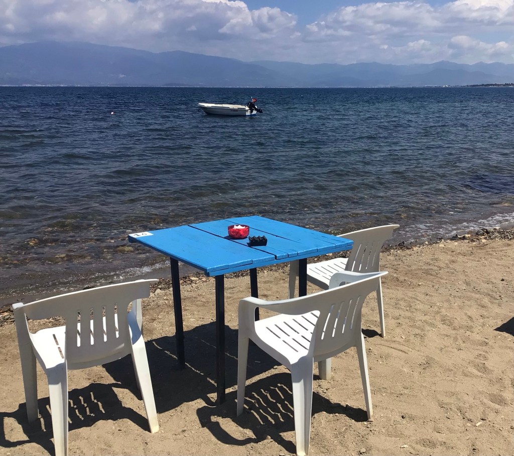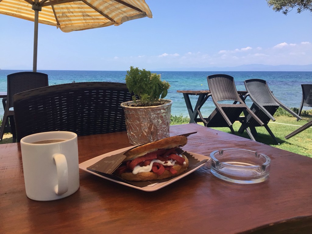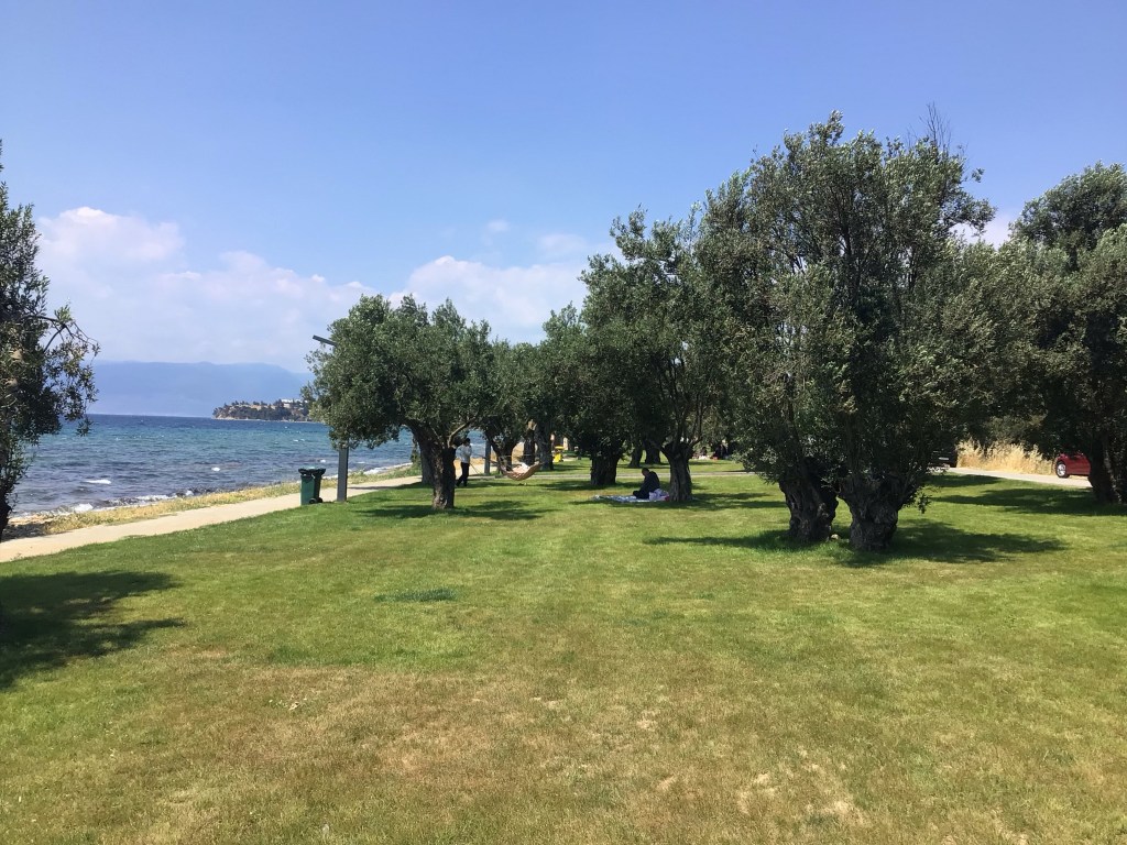 Je finis par arriver le long d’une plage bordée par une magnifique pelouse plantée d’oliviers. Les gens y pique-niquent et y bronzent. C’est d’un calme. Quant à moi, je me pose dans le seul café du coin où la patronne me confectionne quelque chose à manger. Ce sera surprise. Finalement, c’est un toast avec de la charcuterie et du fromage frais accompagné, non pas d’un thé au lait, mais d’une bière !