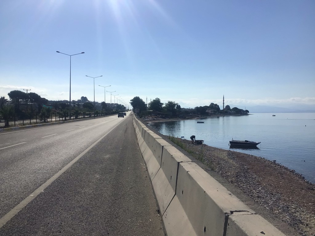 Je la traverse en suivant une piste cyclable où énormément de marcheurs et marcheuses se baladent en ce mercredi matin. Puis je retrouve la route principale D550. De toute façon, cette fois-ci, je n’ai pas d’autres choix. Il n’y a que cet itinéraire pour faire le tour de cette immense baie qui mène à Izmir.