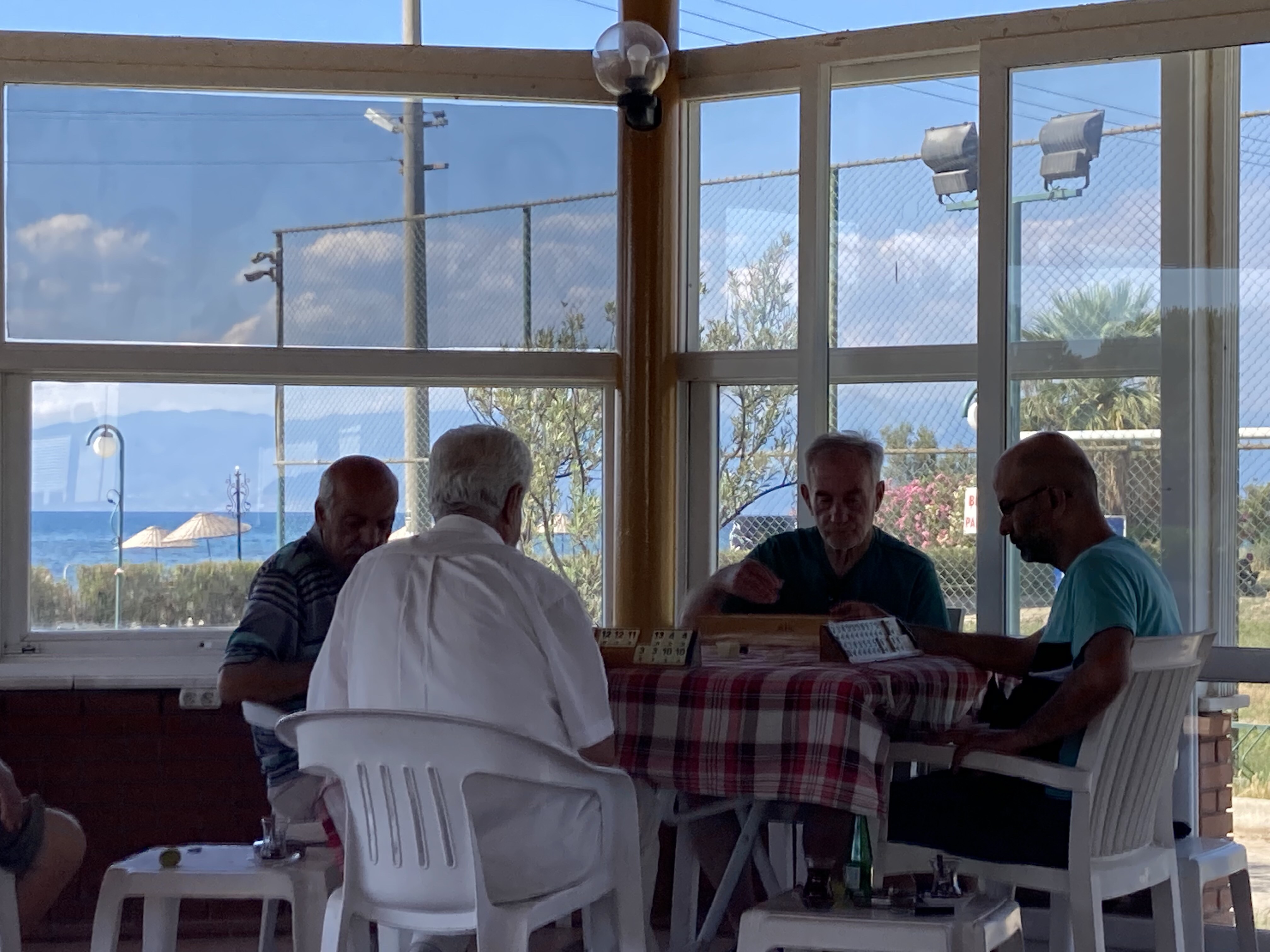 Je me pose dans un café pour mon désormais traditionnel çay et faire le point. Ce café est un repaire de joueurs. Plusieurs tables sont occupées par des messieurs qui s’adonnent à une espèce de dominos géants. Pendant ce temps, la serveuse sert ces messieurs. Je suis abordé par un plongeur (pas du café mais avec palme). Il parle aussi bien que moi anglais. On arrive donc à se comprendre. Comme souvent, il me pose tout un tas de questions sur mon périple. Je lui montre sur mes cartes mon parcours passé et à venir. Pour me remercier et me féliciter, il m’offre mon thé. Toujours aussi sympa ces Turcs.