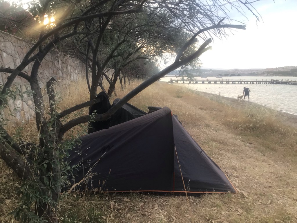 Réveillé par l’appel à la première du matin vers 4h30 ! C’est quand même un peu tôt. Je me rendors pour sortir de mon igloo deux heures plus tard. Le soleil perce au-dessus des arbres. Je plie mes gaules puis déjeune sur mon petit muret devant la mer. Énormément de marcheurs font leur exercice matinal sur la promenade au dessus de ma tente. Quant à moi, c’est un joggeur avec son chien qui fait des aller-retours sur la plagette.
