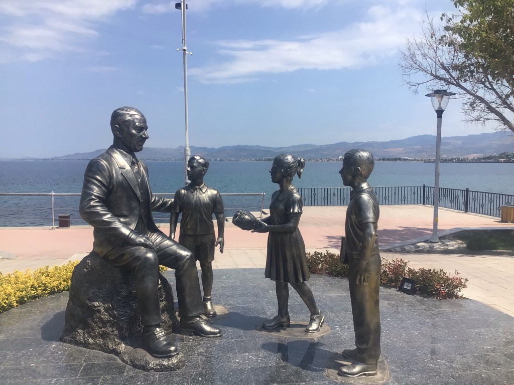 Je me pose dans un café en front de mer mais il n’y a encore pas de wi-fi. Je vais être obligé de me faire un 2ème çay ailleurs après avoir pas mal cherché. Je l’accompagne d’un chausson au fromage et fines herbes. J’ai envie de salé. J’en profite aussi pour appeler mon bro Riri qui est en partance pour … Antalya via Istanbul. Il va courir l’UTVL (Ultra Trail de la Voie Lycienne), une course dans la montagne de 180kms en 6 étapes avec 8.000D+. Encore un sacré défi pour le phénomène. De mon côté, avant de quitter cette baie, je salue ces 3 enfants et cette personne dont je ne connais pas le nom (Atartük ?).