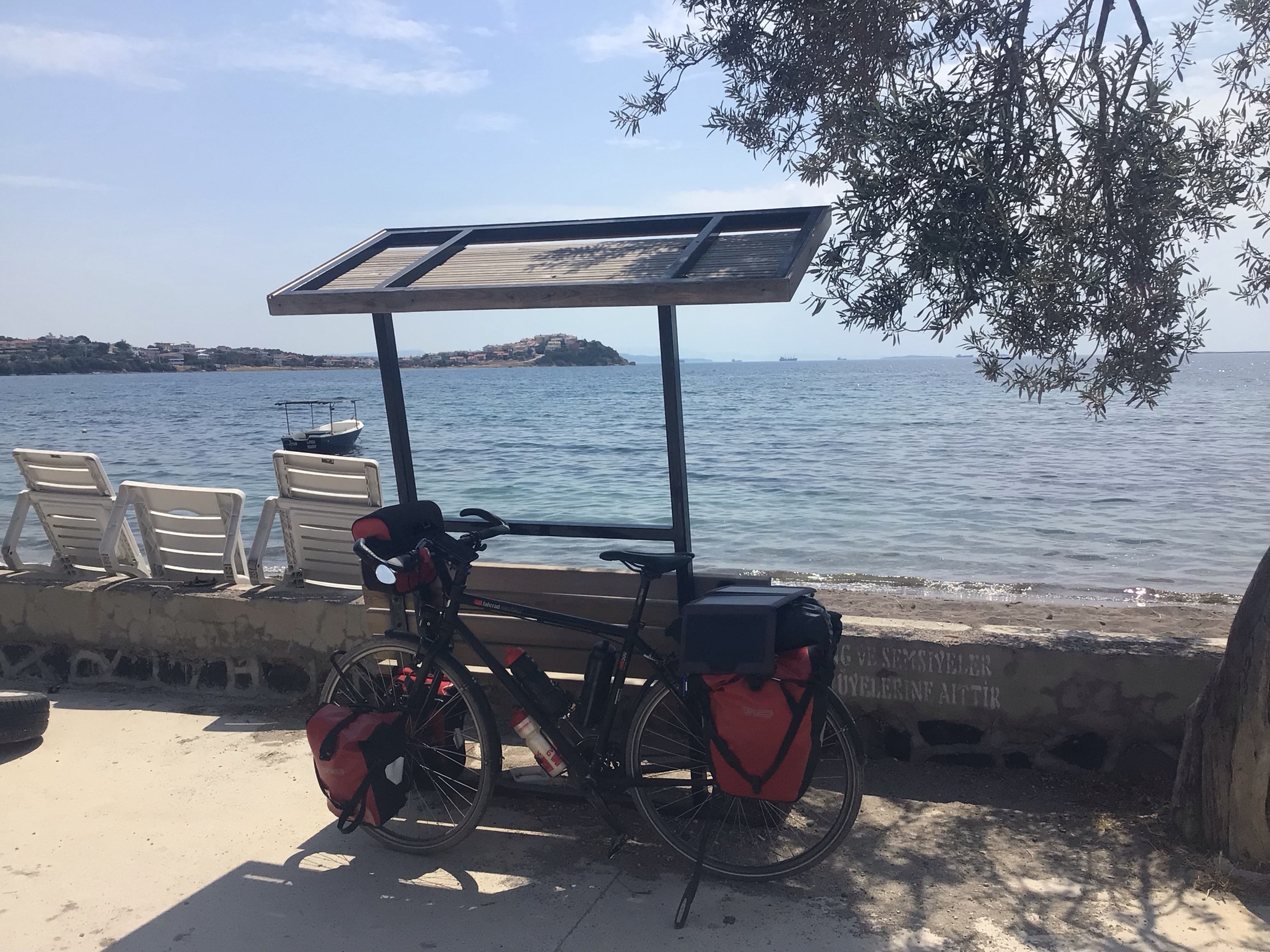 Je me pose pour étudier les lieux. Cela va s’avérer compliqué. Au sud : zone pétrolière. A l’ouest : la mer. A l’est : la ville. Au nord : j’en viens ! Si je continue ma route D550, je rentre à nouveau dans les terres en direction d’Izmir où la circulation s’intensifie et où je ne suis pas sûr de trouver un coin sympa. Je longe le golfe jusqu’à la zone pétro-chimique mais je ne trouve aucun coin tranquille pour bivouaquer. L’affaire se complique. Je tente une recherche de camping sur Maps.me. Il m’indique un emplacement « 1 tent » à l’est. Bizarre ? Je m’y rends. Aucun panneau. Aucune indication. Je tombe sur une pinède au-dessus de la ville. Je vais faire quelques courses puis étudie la topographie des lieux. Je prends finalement un chemin et grimpe en haut de la colline. Je trouve assez facilement un emplacement où me poser. Par contre, ni baignade, ni bière (magasin musulman) pour ce soir, ce sera couture (mon short Fox se découd et mes manchons blanc sont troués) !