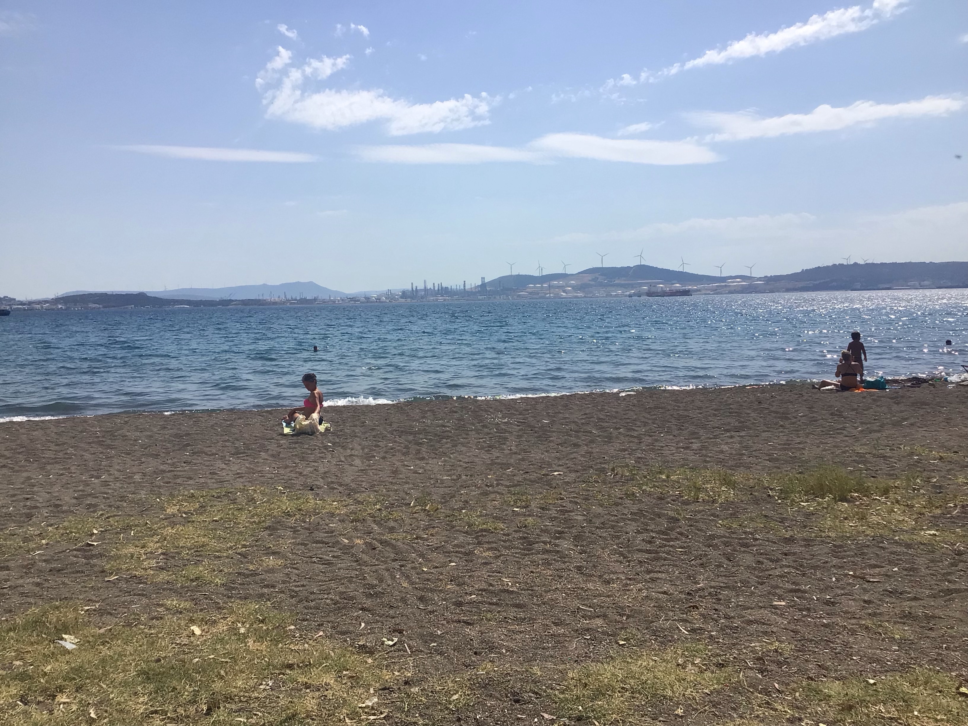 Je suis à nouveau obligé de reprendre la route D550 pour couper une péninsule et traverser une rivière. Il est bientôt 16h00 et j’arrive à l’entrée de la grande ville portuaire de Aliaga. Je récupère une belle piste cyclable qui longe la mer et un parc. Par contre, l’environnement ne donne pas trop envie de se baigner.