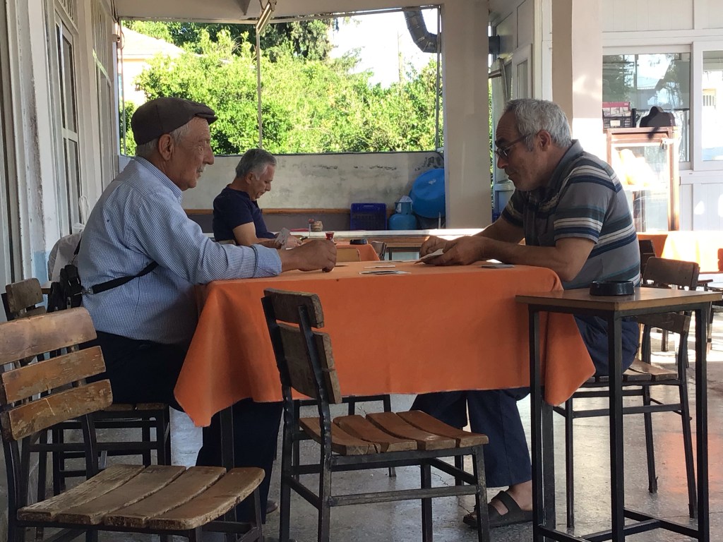 A Enneköy, je bifurque à droite pour trouver une petite route. Comme je n’arrive toujours pas à recharger mon iPhone, je vais tenter de faire sans au maximum pour économiser les 60% de batterie restante. Je vais donc essayer de ne pas me paumer en passant par ces chemins de traverse. Je m’arrête dans ce village rural pour y boire mon premier çay de la journée. Des joueurs de carte sont déjà au boulot en ce jeudi matin.