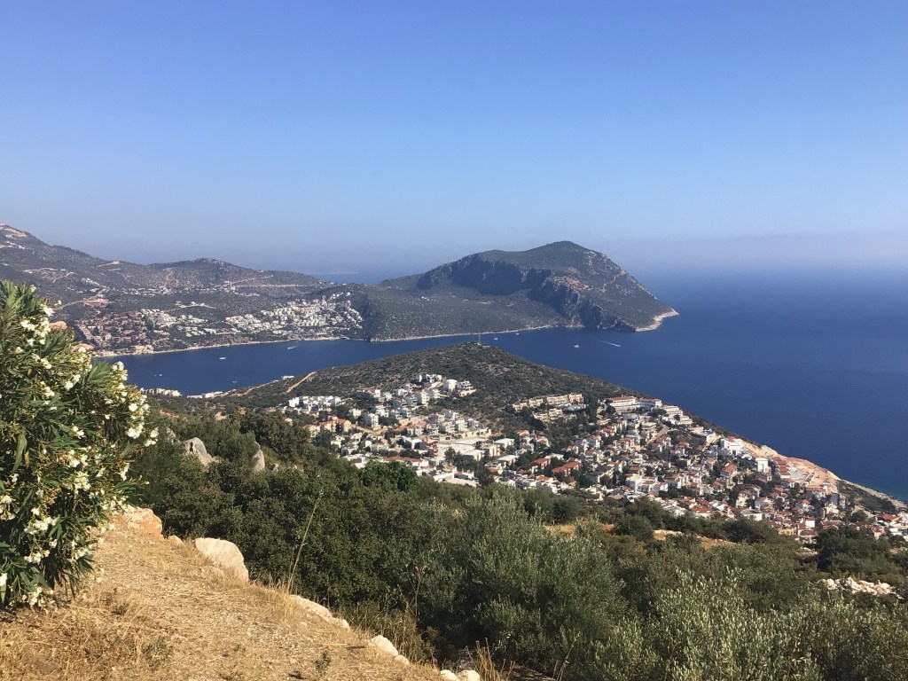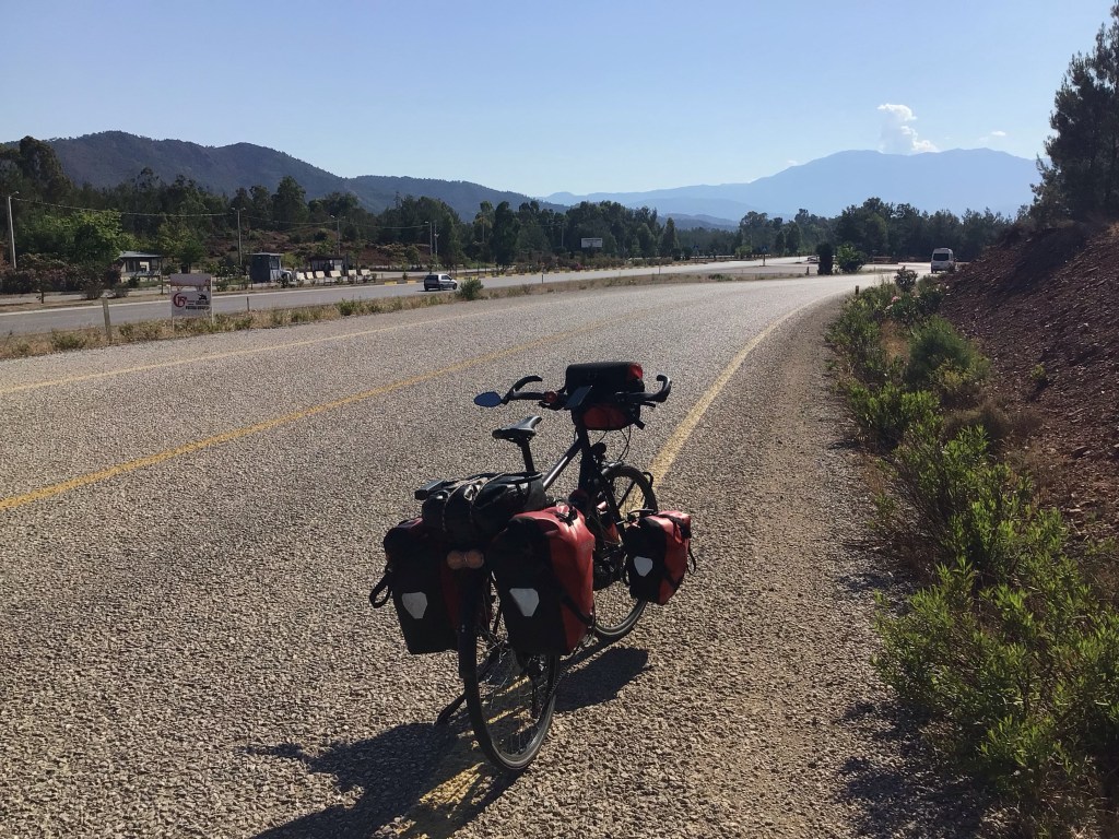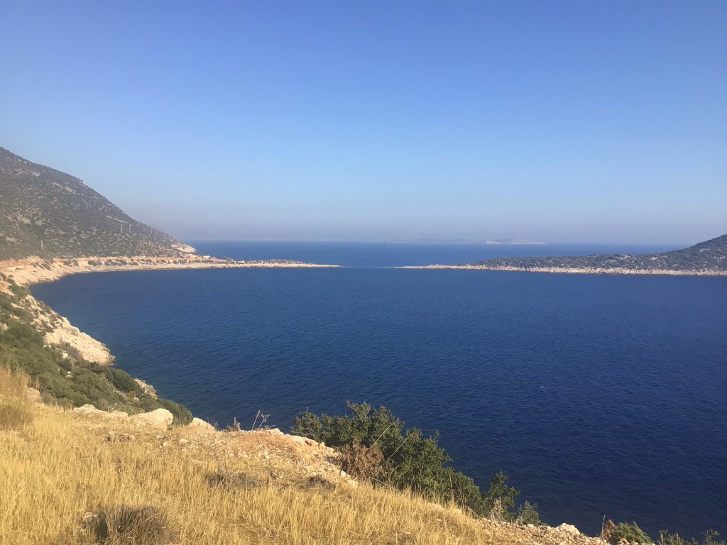 Je retourne sur la route D400 et, comme je suis en fond de vallée, il faut à nouveau grimper un col et, ce, toujours en plein cagnard. Je double à nouveau un turc, mais en mode cyclotouriste chargé comme un mulet, qui pousse son vélo à l’ombre de la montagne. Le pauvre me fait peine. Je le salue mais il ne me répond pas. Une fois la bascule effectuée, je retombe sur la mer avec, à nouveau aussi, des paysages à couper le souffle. J’arrive à Karkan. Vu le dénivelé pour descendre au port, je continue ma route.