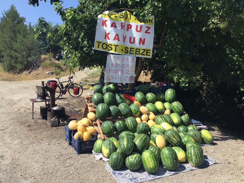 Je retrouve ma bande d’arrêt d’urgence et mes coups de klaxon pour m’encourager. D’énormes travaux sont à nouveau en cours dans ce secteur. La D400 est une 1*1 voie qui est en cours de passage en 2*2 voies. Il y a des chantiers sur de nombreux kilomètres. La route est agréable et traverse une immense vallée où les villages se suivent les uns, les autres. C’est une région de maraîchage notamment de tomates et de melons. D’ailleurs, il y a beaucoup de stands le long de la route. Je m’arrête à l’un d’eux où je peux aussi y boire un çay.