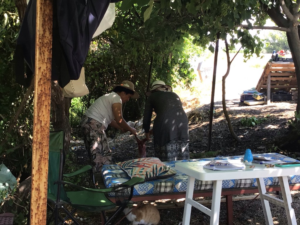 Ce stand est tenu par deux femmes (mère et fille ou frangines, je ne sais). La plus jeune, une belle jeune femme me pose beaucoup de questions avec son traducteur. J’en profite aussi pour manger un melon d’eau. Quant un Combi VW immatriculé en France (74) arrive. C’est un jeune couple auxerrois en vadrouille. Lauren, jeune femme blonde pétillante et bavarde et Lahcen, beau brun ténébreux plus réservé mais très sympa. Elle bosse à son compte sur Internet. Lui est dans le bâtiment. Ils sont partis pour 6 mois avec leurs deux chiens et ont suivi le même itinéraire que moi. Par contre, eux remontent vers le Cap Nord. J’aimerais bien mais cela va faire un peu, beaucoup … Nous passons un long moment à discuter autour de çay. Quant aux deux femmes, pendant ce temps, elle dépiautent un lapin renversé par un automobiliste.