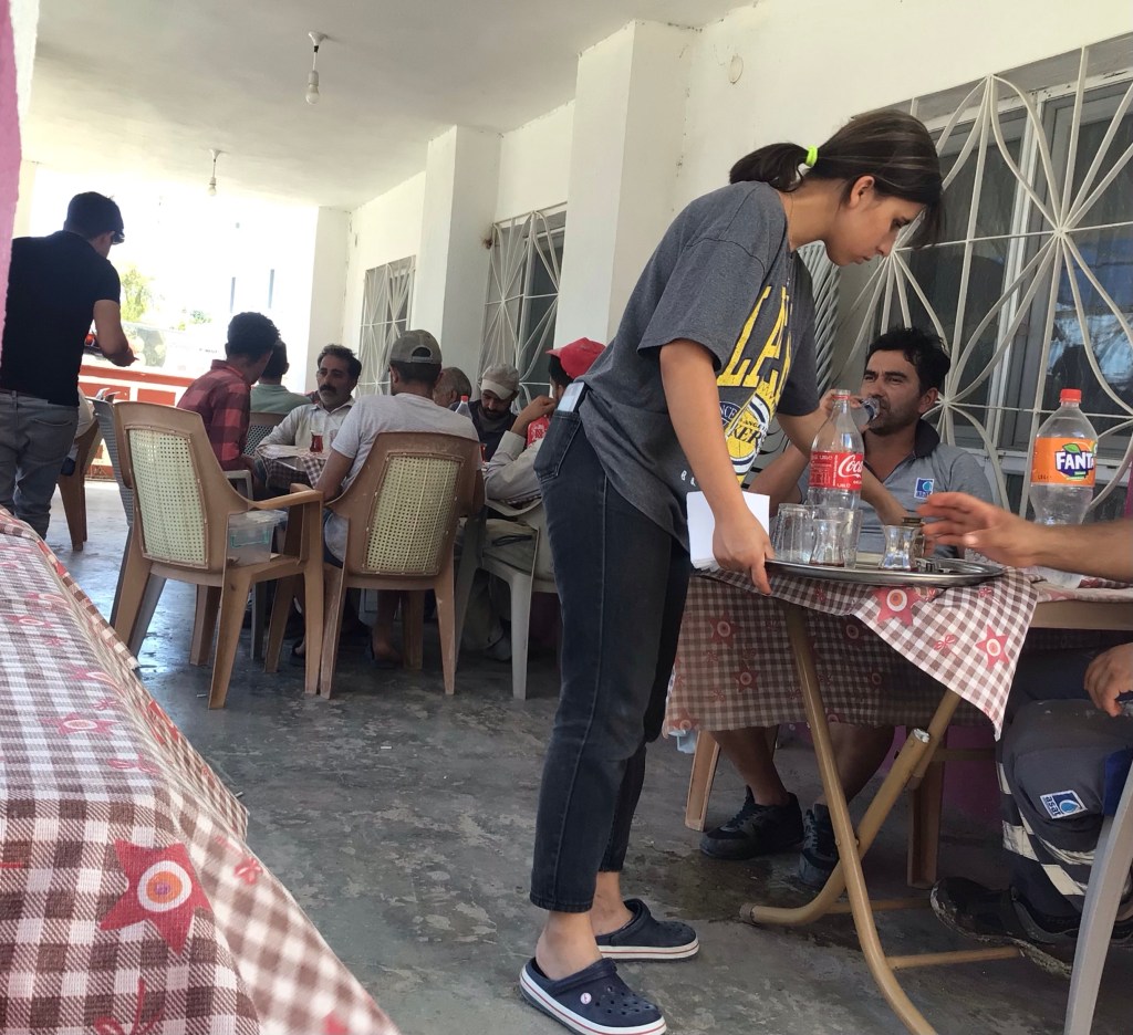 Il est temps de se repartir chacun de son côté. Bon voyage les jeunes ! Je reprends ma route solitaire qui devient un peu plus montagneuse. Par contre, l’heure avance et je commence à avoir faim. Entre mes arbres à mûres et mes abricots picorés ici et là ainsi que ma moitié de melon d’eau, cela ne nourrit pas son cyclotouriste. Des panneaux indiquent un restaurant. Je les suis jusqu’en haut du village de Kinik et tombe à nouveau sur un restau ouvrier : poulet en sauce, riz et haricots blancs avec le verre de Coca-Cola, la salade de crudités et le çay offert. Et tout cela, pour la modique somme de 40TL (2,50€ !). Le fiston et la fille sont au service, la mère en cuisine et le père au four et au moulin. Et ça usine ! Sur la table du fond sont attablés des syriens.