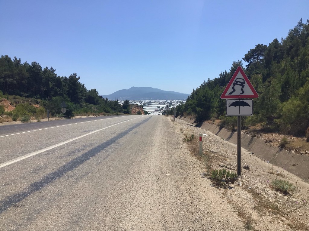 Les batteries sont rechargées. Je peux repartir en direction de la mer et de Patara. Je pense y arriver plus tôt que prévu mais, en fait, ce n’est pas la mer mais un océan de serres. Après avoir rencontré le couple d’Auxerre, je tombe sur la vallée « aux serres » ! Par contre, je connais ma plus grosse frayeur depuis mon départ (hormis le vent). En bas de la descente, alors que je roulais à bonne allure, un taré me double avant de se rabattre pour tourner à droite. Heureusement que j’avais les mains sur les freins. J’ai dû passer à 30cms de sa bagnole. Il ne lui a rien manqué. Il s’est même fait klaxonné par d’autres automobilistes. C’est chaud parfois …