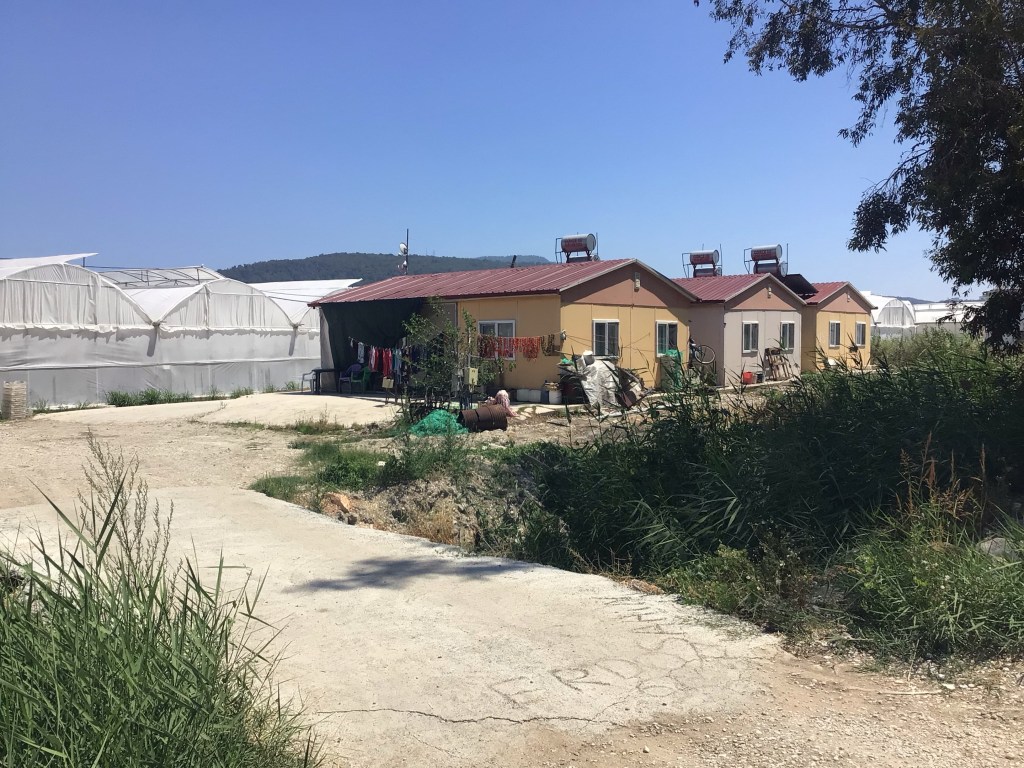 L’envers du décor des serres n’est pas terrible non plus. Peut-être ces mêmes syriens rencontrés au restau sont-ils hébergés dans ces baraques entre serre et fossé aux eaux pesticidées ?A