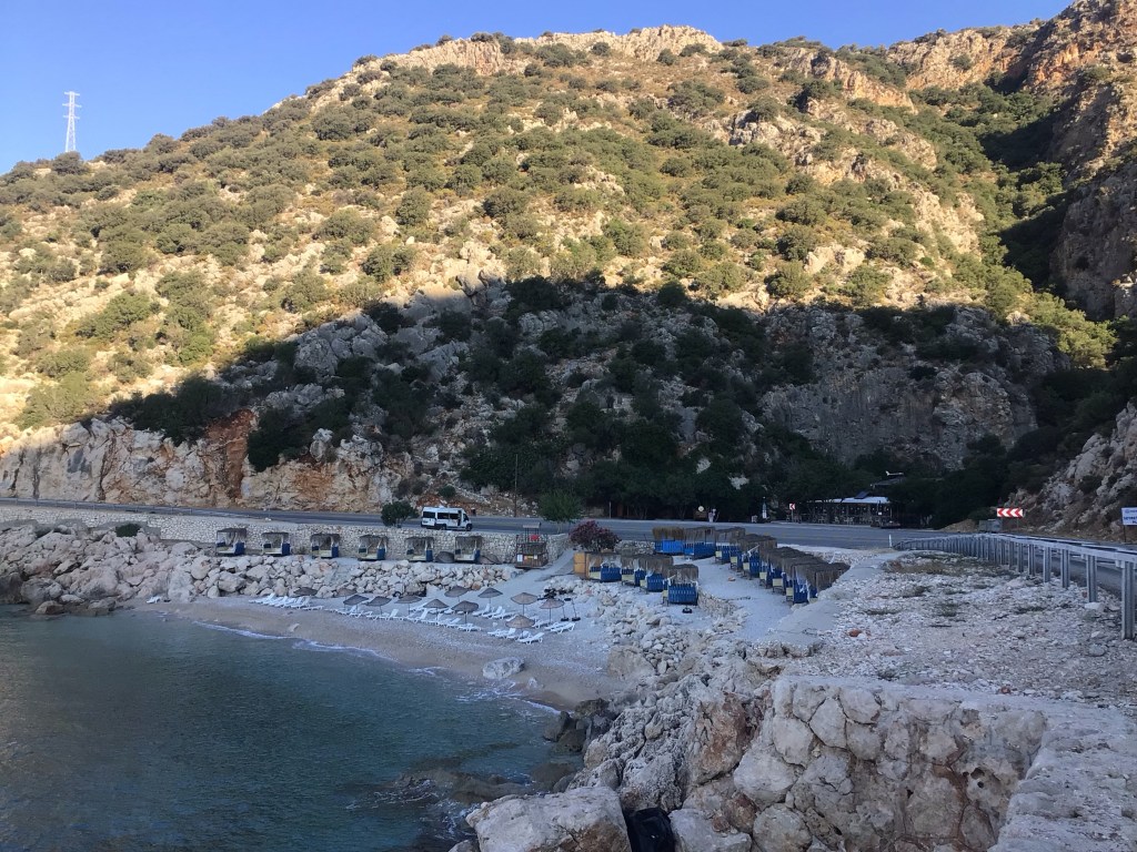 Je file sur Kas toujours en empruntant la corniche D400. J’admire à nouveau ces îlets dans le soleil levant. La route est très calme à cette heure. C’est le pied mais ça ne va pas durer …