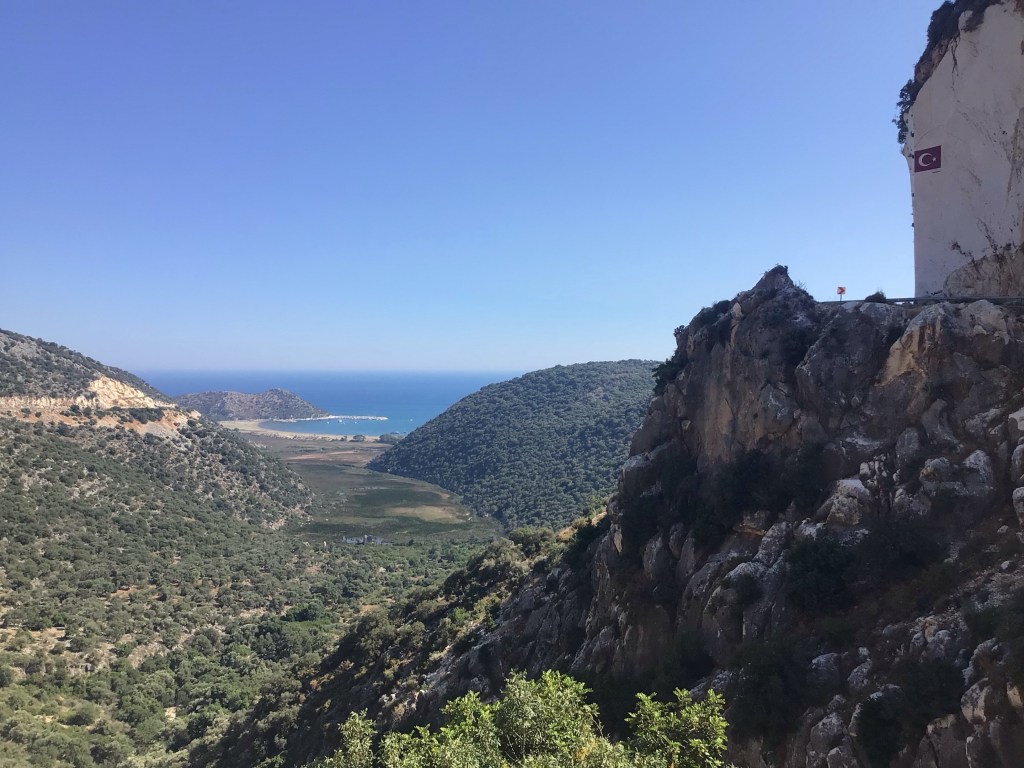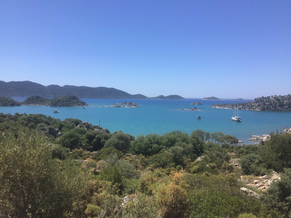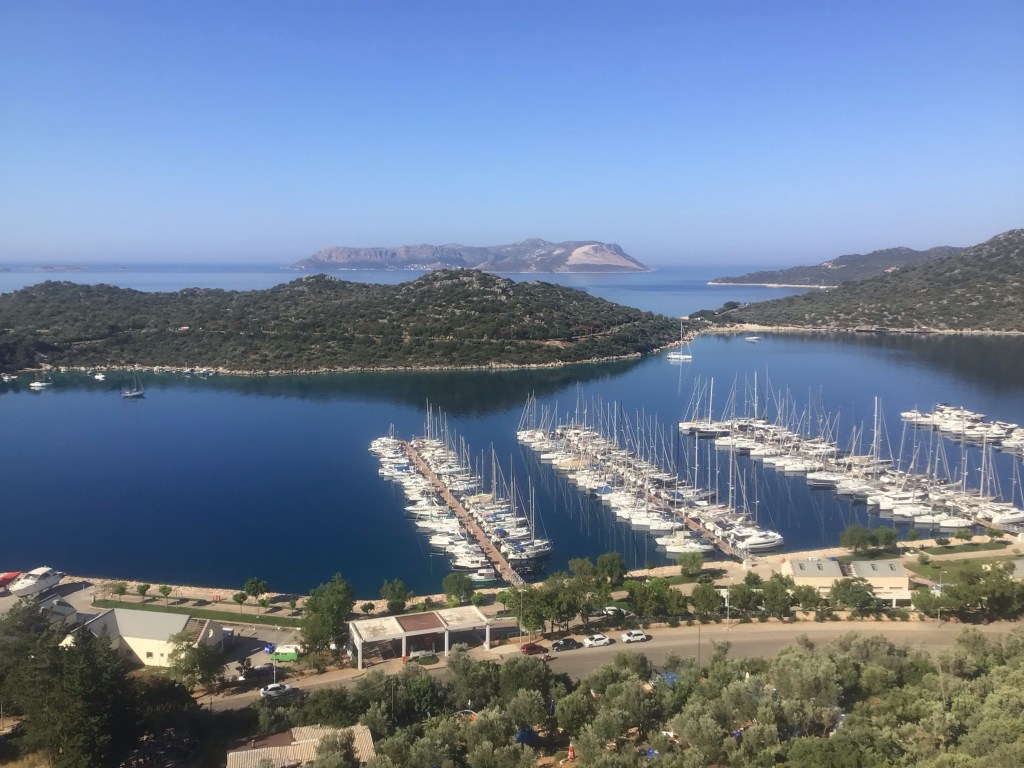 Et c’est là que les choses se compliquent. Je pars dans la montagne en escaladant un col qui n’en finit pas. Je suis scotché à la route. Pourtant ce matin, j’ai un peu la pression. Comme je ne peux plus utiliser mon GPS iPhone, j’ai noté à l’ancienne ma route pour aller à Simona Castle. Nous y reviendrons. Une fois arrivé en haut du col, cela redescend évidemment mais pour remonter de plus belle. J’arrive à une bifurcation avec un panneau marron indiquant Kekova. Je regarde sur mon papier. Je n’ai pas ce nom dans les villages notés. Je continue ma route. Au bout de quelques kilomètres, je m’arrête à nouveau et branche mon GPS iPhone. Il fallait tourner à droite lorsque je me suis arrêté. Kekova est le nom d’une île que je n’ai pas noté évidemment. Demi-tour. Je fulmine. Je reprends cette petite route ô combien difficile aussi et arrive dans le port perdu de Kaleüçagiz. C’est magnifique !
