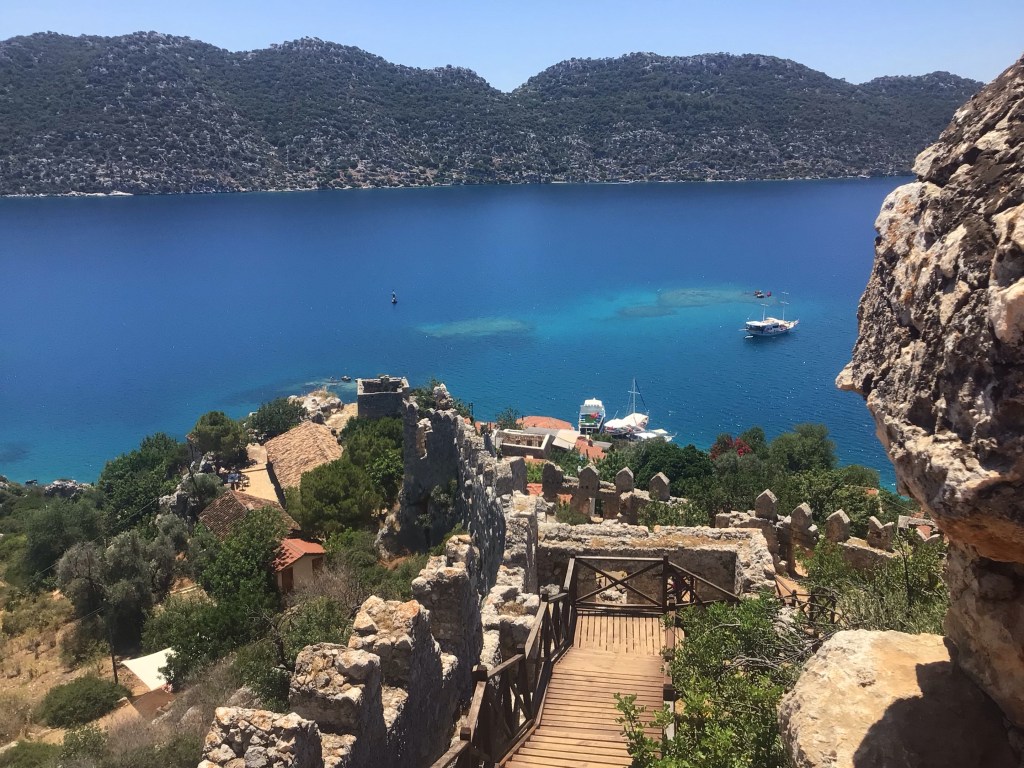 L’accueil de Cyrus l’organisateur, de son équipe et des autres coureurs et coureuses est très chaleureux. Après avoir bu une bonne bière Efes bien fraîche et pris quelques photos, Cyrus me propose de les accompagner sur une embarcation pour faire le tour des îlets et déjeuner. J’accepte avec grand plaisir. Je redescends pour récupérer mon vélo et les rejoindre sur le port, prends un chemin qui ne mène nulle part, reviens, demande mon chemin à un turc ne parlant que turc et finis par comprendre que je dois m’y rendre à pieds. Je pose à nouveau mon vélo, grimpe 4 à 4 la voie menant au château et descends la voie menant au village et au port. Las. Le bateau est parti. Quel imbécile ! Je suis comme un con, seul sur le quai, avec des restaus et d’autres bateaux qui me narguent. Par contre, le site est exceptionnel. Le seul accès se fait par la mer ou par cette voie lycienne en laissant sa voiture sur un parking.