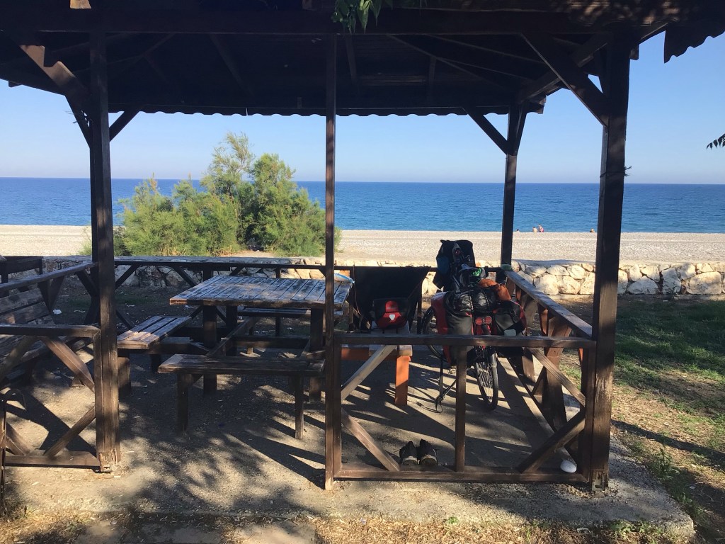 Alors que je me prépare mon çay, un gars vient me demander d’intervertir nos abris je ne sais trop pourquoi. Je lui explique que je vais dormir sur le banc cette nuit. Il me fait comprendre qu’il partira avant la nuit et qu’il me fera signe. J’espère bien. Alors que j’ai changé d’emplacement, un vieux monsieur vient faire causette. Il me dit qu’il a travaillé très longtemps à Munchen (Munich) et me demande mon parcours à moi. Difficile d’expliquer en allemand ou en turc. On se salue. Il part sur la plage avec ce que je pense être une serviette. L’appel à la prière retentit. C’est en fait son tapis de prière.