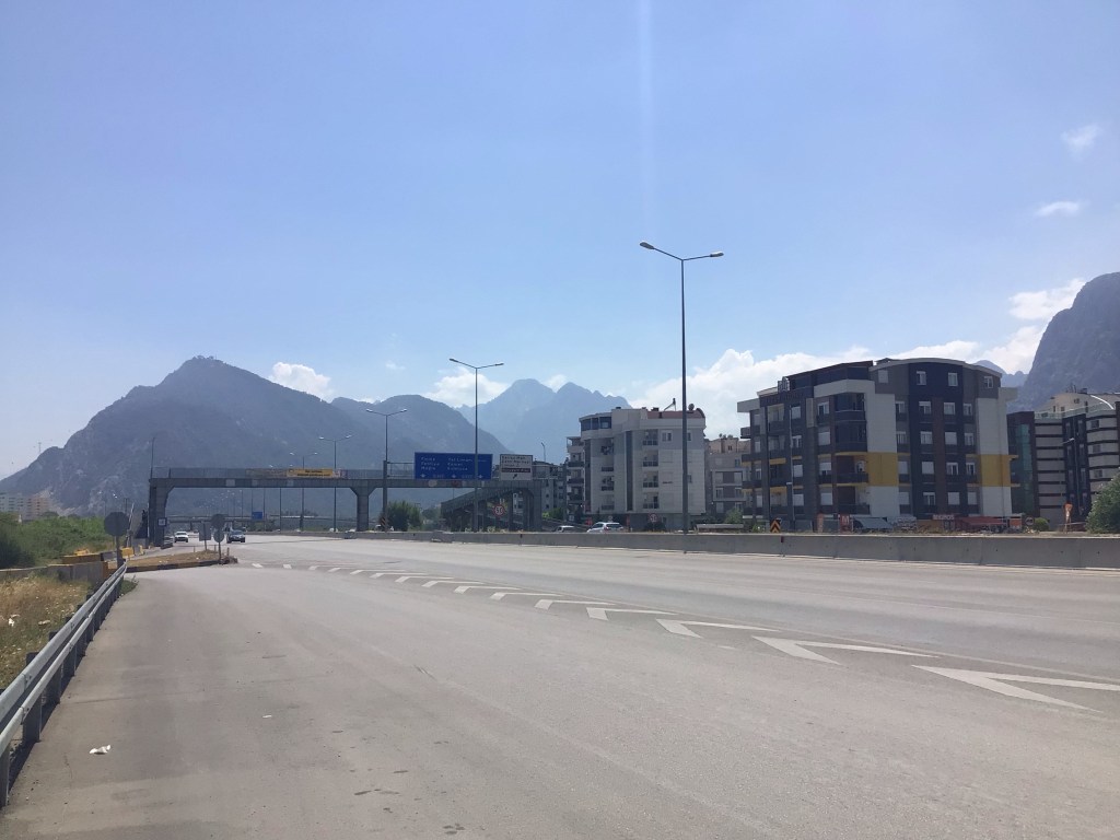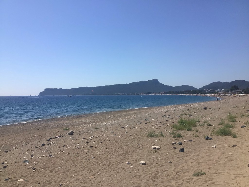 Je quitte cette jolie ville de Kemer surplombée par le mont Tahtali surnommé l’Olympe Lycien qui culmine à 2.366m et est accessible en téléphérique. Je repars tranquillement en milieu de matinée par la D400 vers Antalya. Aujourd’hui, je vais être en « roue libre ». Maintenant qu’elle fonctionne à nouveau, et c’est quand même beaucoup plus facile et sécurisant de rouler ainsi, je m’y mets aussi ! Je poursuis mon bonhomme de chemin avec toujours la mer turquoise d’un côté et les flancs de montagne à pic sur ma gauche. Je traverse ainsi Beldibi et me pose à nouveau pour faire un plouf sur une plage de gros galets. J’arrive en fin de matinée dans l’immense baie d’Antalya.