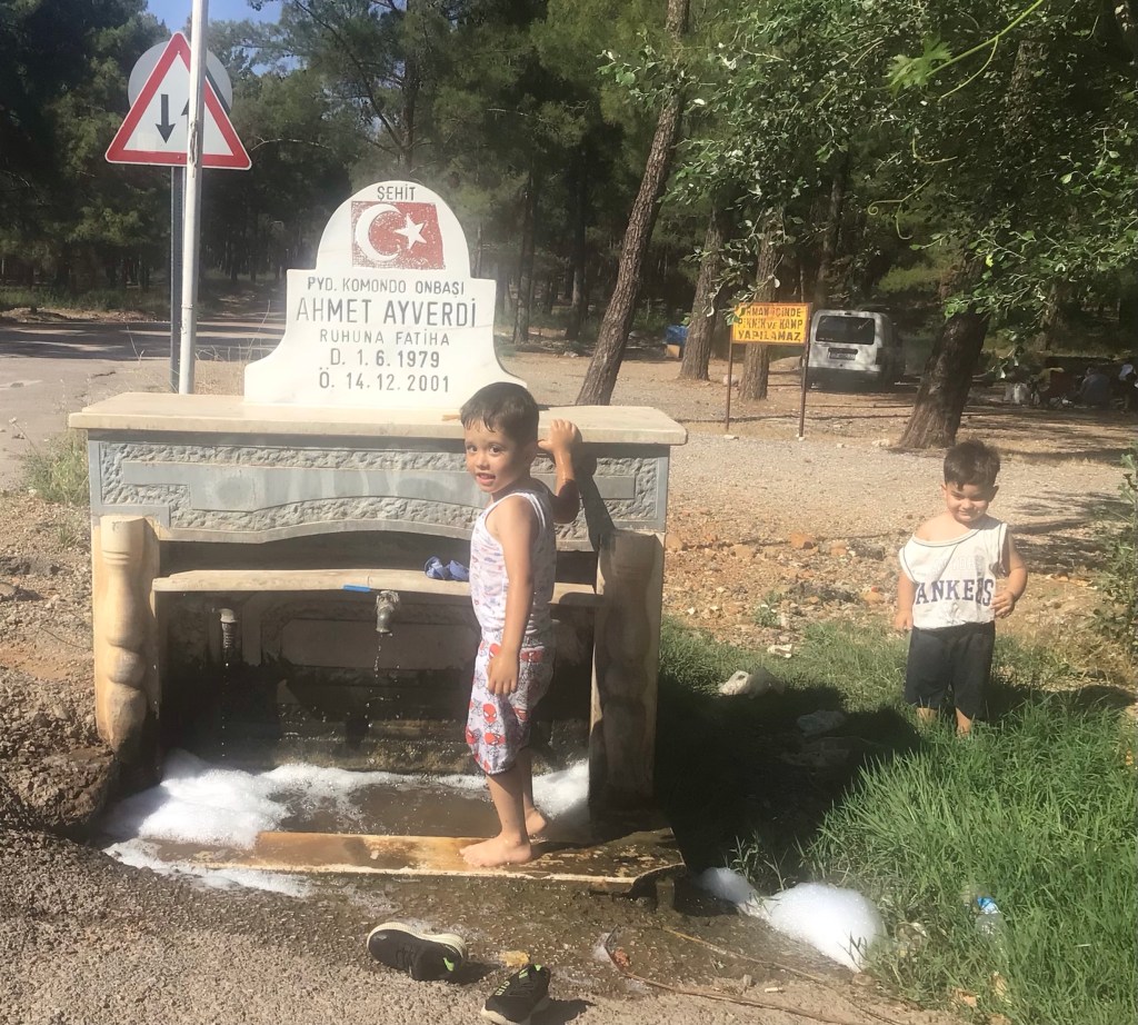 Je poursuis tranquillement ma route vers Termessos. Un panneau indique un point d’eau. Je m’y arrête. L’eau fraîche achetée en boutique devient chaude au bout de trente minutes. Et, vu la quantité que je bois dans la journée, heureusement que je tombe sur ces « sources ». Contrairement aux autres pays traversés depuis le début de mon périple autour de l’Europe, ici aucune stèle ne marque la mort d’un automobiliste, motocycliste, cycliste ou piéton. Je pense (il faudra le confirmer) que ces points d’eau sont des sortes de stèles érigées en l’honneur d’un disparu. Là, c’est un gamin qui se fait un plaisir de me remplir tous mes bidons à l’approche de mon futur bivouac.