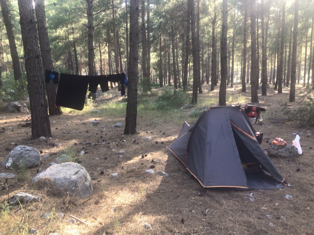 En effet, peu avant 17h, j’arrive à l’entrée du Parc National de Termessos et du mont Güllück. Il ferme à 17h30. Je demande au gardien si je peux planter ma tente à l’entrée mais ce n’est pas possible. Il m’indique un café-restau-camping à 800 mètres. Je m’y rends. Je tombe sur Hamed un jeune turc débrouillard qui, avec son traducteur et son anglais scolaire, essaie de me faire comprendre qu’il n’y a que des chalets à louer et qu’il me faut aller dans un autre camping pour planter ma tente. Il m’offre un çay. Je lui achète une bière. Ce jeune doit effectuer son service militaire (soldier) pendant 6 mois avant de partir aussi en voyage. Vu comment il se débrouille, ça devrait le faire. Je pars dans la pinède pour trouver un emplacement et me poser pour la soirée.