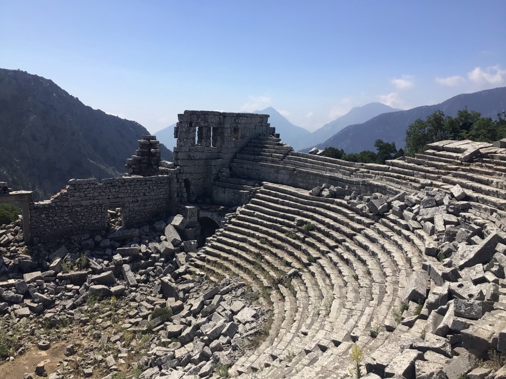 Je poursuis ma visite en suivant le cheminement pour arriver jusqu’au théâtre. Et là, c’est l’apothéose : c’est l’un des plus beaux monuments archéologiques que je n’ai jamais vu. Ce site antique aurait été bâti 1.000 AV JC. Il se situe dans les montagnes de Taurus à 1.000m d’altitude. Les blocs de pierre sont ajustés les uns par rapport aux autres avec un système de chevilles et de trous percés dans chaque bloc, mais sans mortier. La tribune, sur la photo ci-dessous, repose sur un mur en aplomb. C’est vraiment impressionnant. Il est fort dommage qu’un tremblement de terre ait endommagé ce site.
