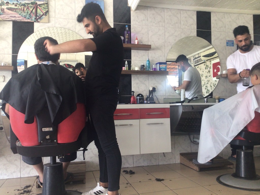 A la sortie de cette banlieue, je remarque un panneau Kuaförü. Je m’y rends et me fais couper les tifs et élaguer la barbe. Aucun des 2 coiffeurs ne parlant anglais, il n’est pas évident de demander au mien (en tee-shirt noir) ce que je veux. Je mime sa coupe et sa barbe et qu’il se débrouille. Par contre, avec les autres clients, ils ont l’air de bien de s’amuser à mes dépens.