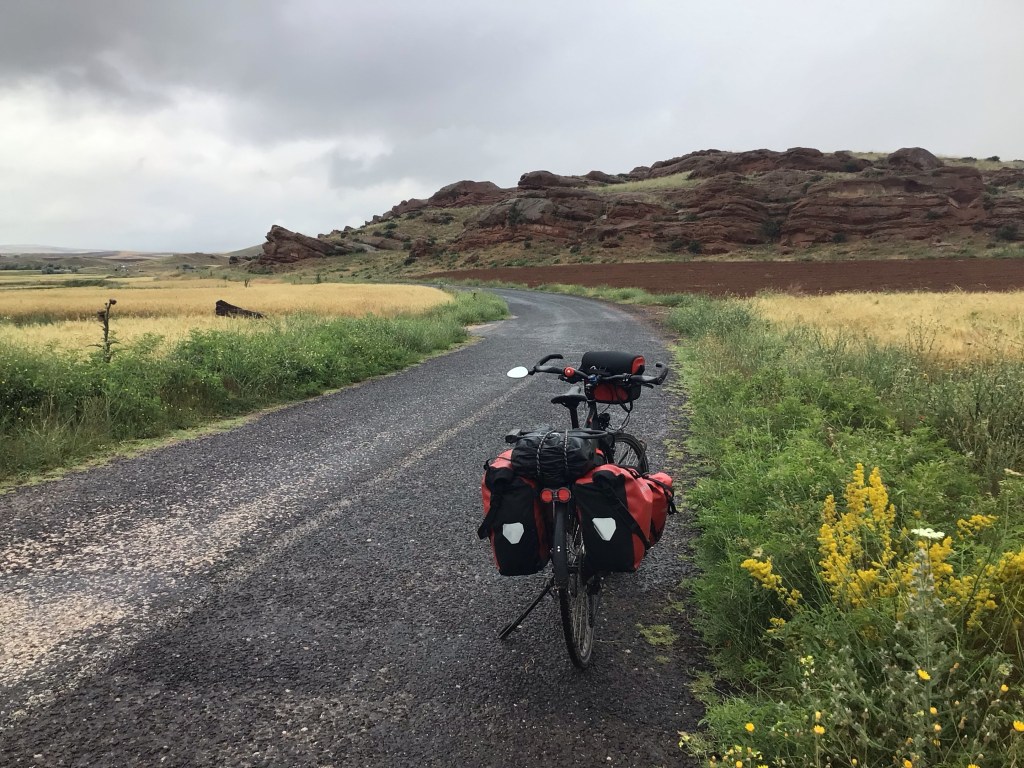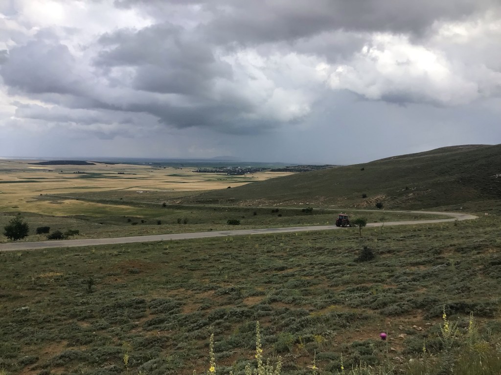 Après une montée interminable à 5 à 6%, j’aperçois au loin des immeubles neufs qui émergent au-dessus des champs de blé. La ville approche. J’arrive en vue de Hacibektas sous une grosse averse. Je me pose dans une boulangerie-café bienvenue. Les enfants de la boulangère jouent à la vidéo. Je leur demande leur internet pour me connecter. La pluie s’est calmée. Je repars à travers ces hautes collines parsemées, quand c’est possible, de champsrefois, de blé.