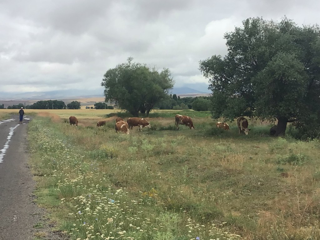 Les averses alternent avec des moments d’accalmie. J’ai sorti ma veste thermique pour me protéger du froid ambiant et de l’humidité ainsi que mon ciré jaune bien évidemment. Je ne vois pratiquement personne à part quelques automobilistes qui me klaxonnent et me saluent au passage. Et un gardien de vaches perdu dans ces immensités qui doit me prendre pour un martien.